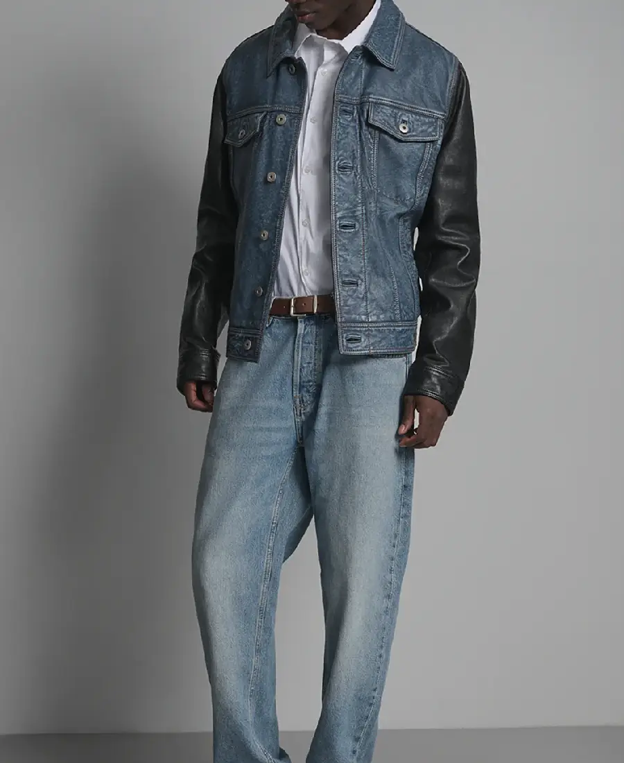 Shop The Beckham Blue And Black Leather Denim Jacket