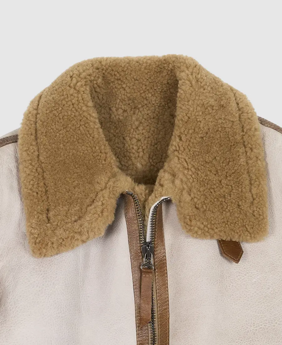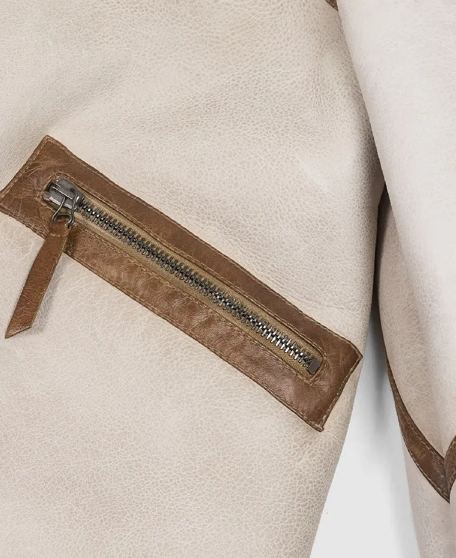 Men’s White Aviator Bomber Jacket is made from premium sheepskin leather in a clean white color that gives it a bold and standout look. The outer leather has a smooth finish that enhances its modern aviator style. The inner is lined with soft sherpa that provides a warm and cozy feel, making it a strong choice for colder days. It features a shirt style sherpa collar that adds a classic aviation inspired touch to the design. The front zipped closure gives it a secure and sleek finish. Full length sleeves come with open hem cuffs that create a relaxed and easy style. It includes two waist pockets along with two inner pockets that offer space for carrying daily items while keeping the overall look clean and well balanced.