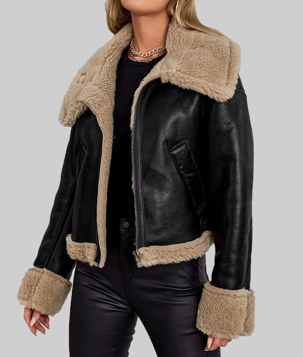 Women Black Leather Shearling Jacket