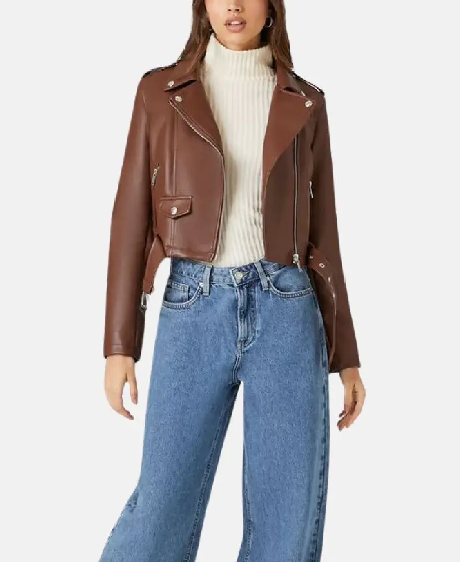 Women’s Brown Cropped Motorcycle Leather Jacket