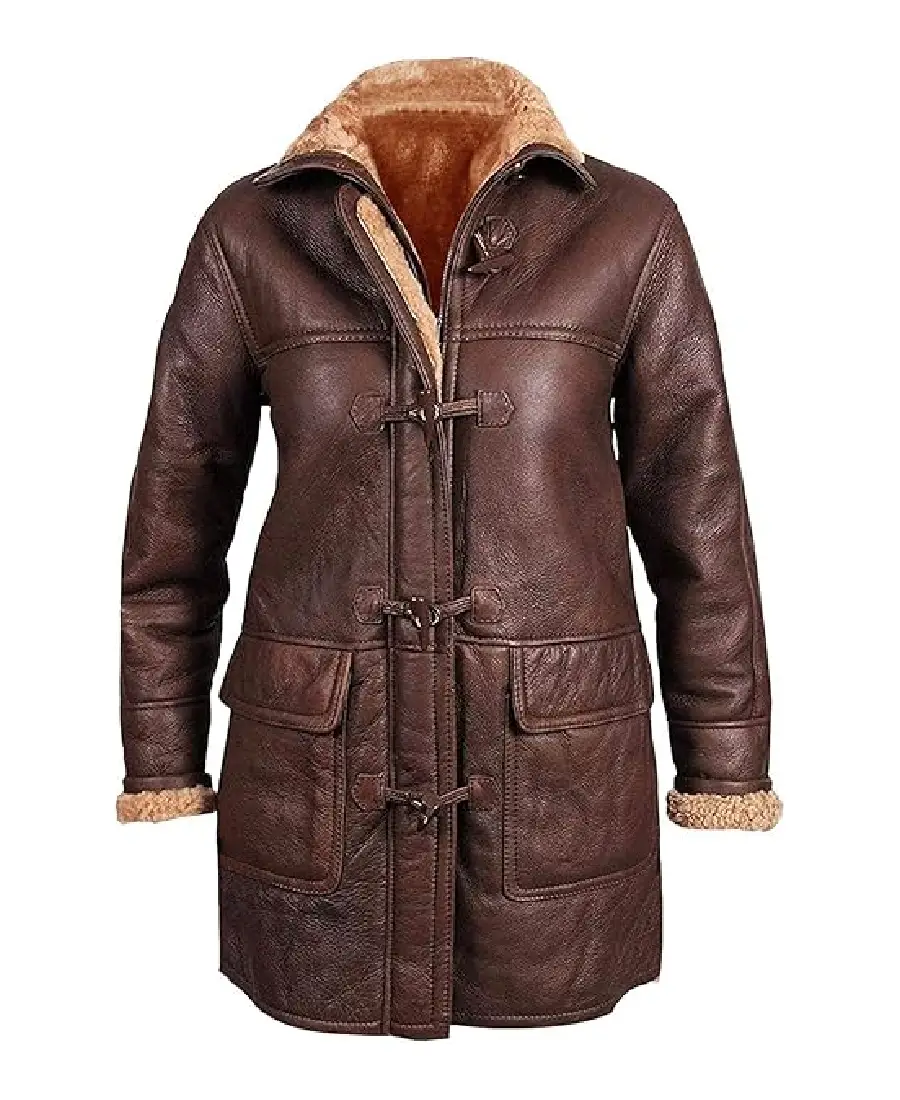 The Women’s Brown Sheepskin Duffle Coat is made from high quality sheepskin leather in a rich brown color that gives it a strong winter look. It features a non-adjustable hood that adds extra coverage during cold weather. The coat includes a classic toggle front closure that brings the traditional duffle coat style. Full length sleeves are finished with open hem cuffs for a relaxed fit. The inside comes with warm shearling lining that provides excellent comfort in colder conditions. Designed with two flap pockets on the outside and one inner pocket, this coat offers space for carrying small essentials while keeping a stylish cold-weather outfit.