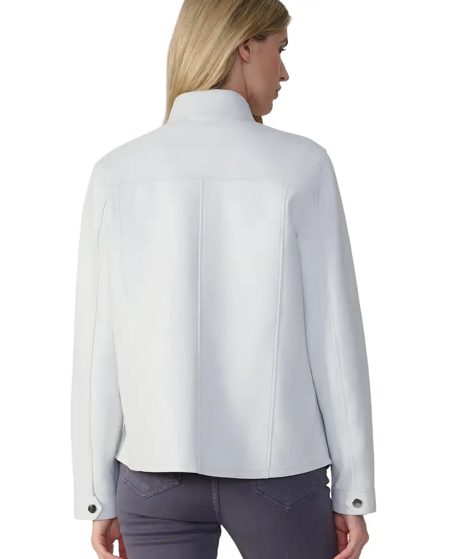 The Women’s White Leather Shirt Jacket in white brings a fresh and structured look to casual outerwear. Made from real leather it has a firm texture that softens naturally with wear and adapts comfortably to the body. The shirt style collar frames the neckline neatly while the snap button closure at the front keeps the fit secure and adds a subtle design detail. Full length sleeves with open hem cuffs allow ease of movement and a relaxed finish that works well for layering. Inside, the viscose lining provides a soft layer against the skin making it comfortable for extended wear. Its clean white color gives a bright and polished appearance that pairs well with a variety of casual and smart outfits.