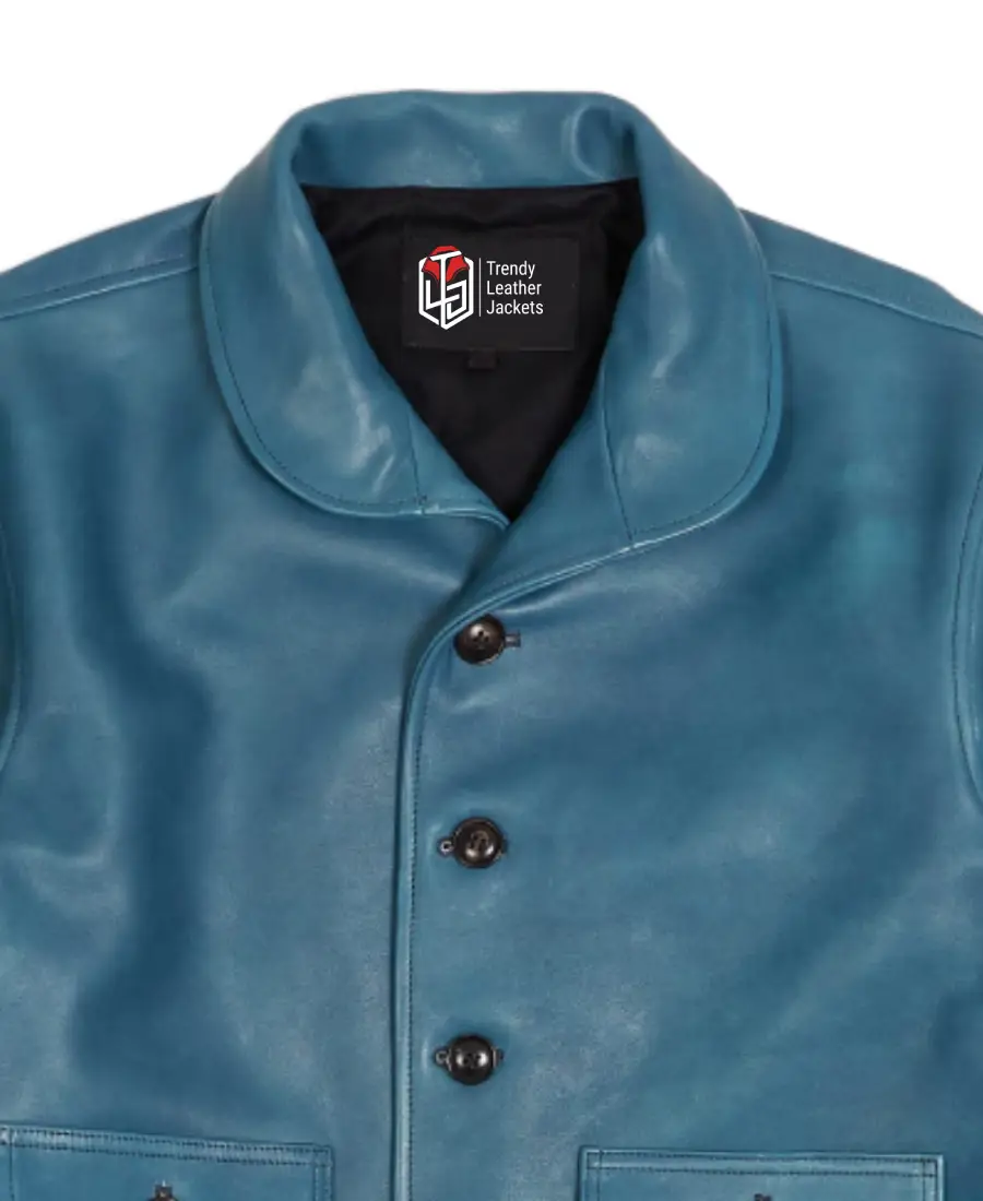 1920s Blue Classic Leather Jacket is made from real leather in a rich blue color that reflects a vintage inspired look from an earlier era. The design carries a timeless feel with a clean and structured appearance that stands out without being overdone. It features a shirt style collar that adds a classic touch to the overall style. The front button closure gives it a traditional finish that fits well with its old school aesthetic. Full length sleeves are paired with button cuffs that add a neat and defined edge. The inner viscose lining provides a smooth layer inside for easy wear throughout the day. It includes two flap pockets on the front that enhance the classic design.