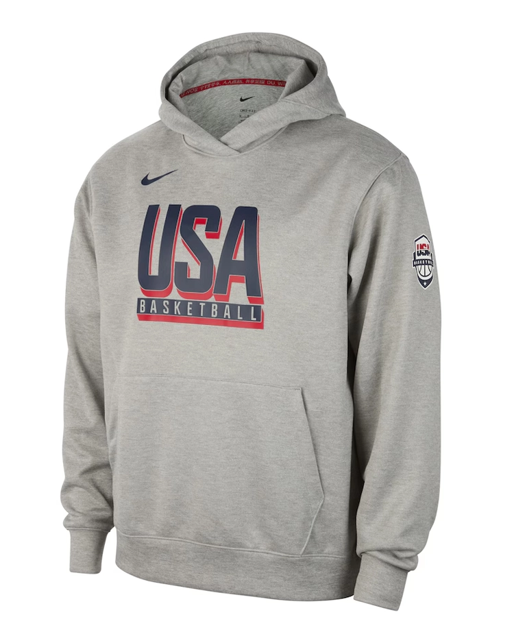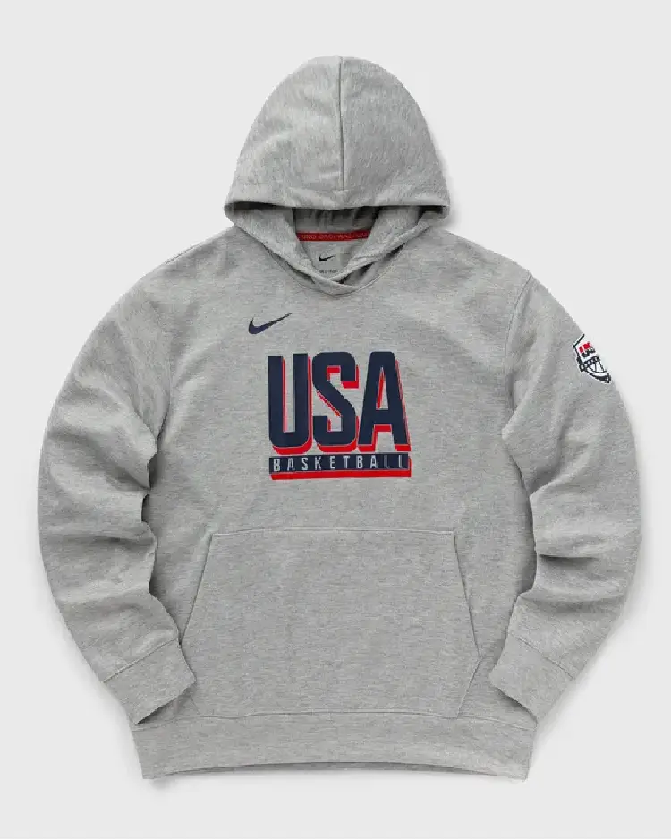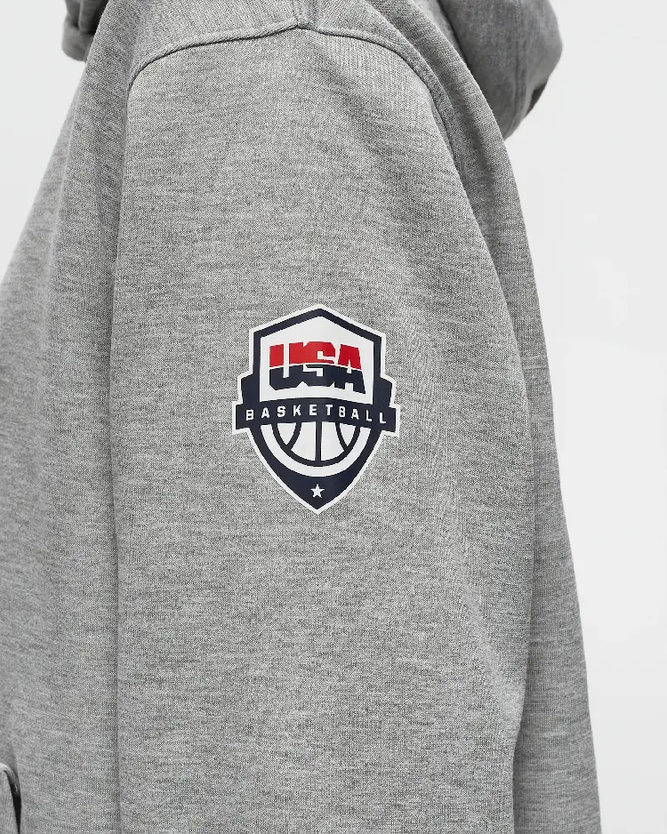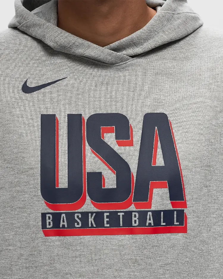 Designed with a modern athletic fit, it includes a front kangaroo pocket, adjustable drawstring hood, and bold Team USA Basketball graphics across the chest and sleeve. Whether you’re shooting hoops or supporting from the sidelines, this hoodie brings Olympic-level energy to your everyday style.