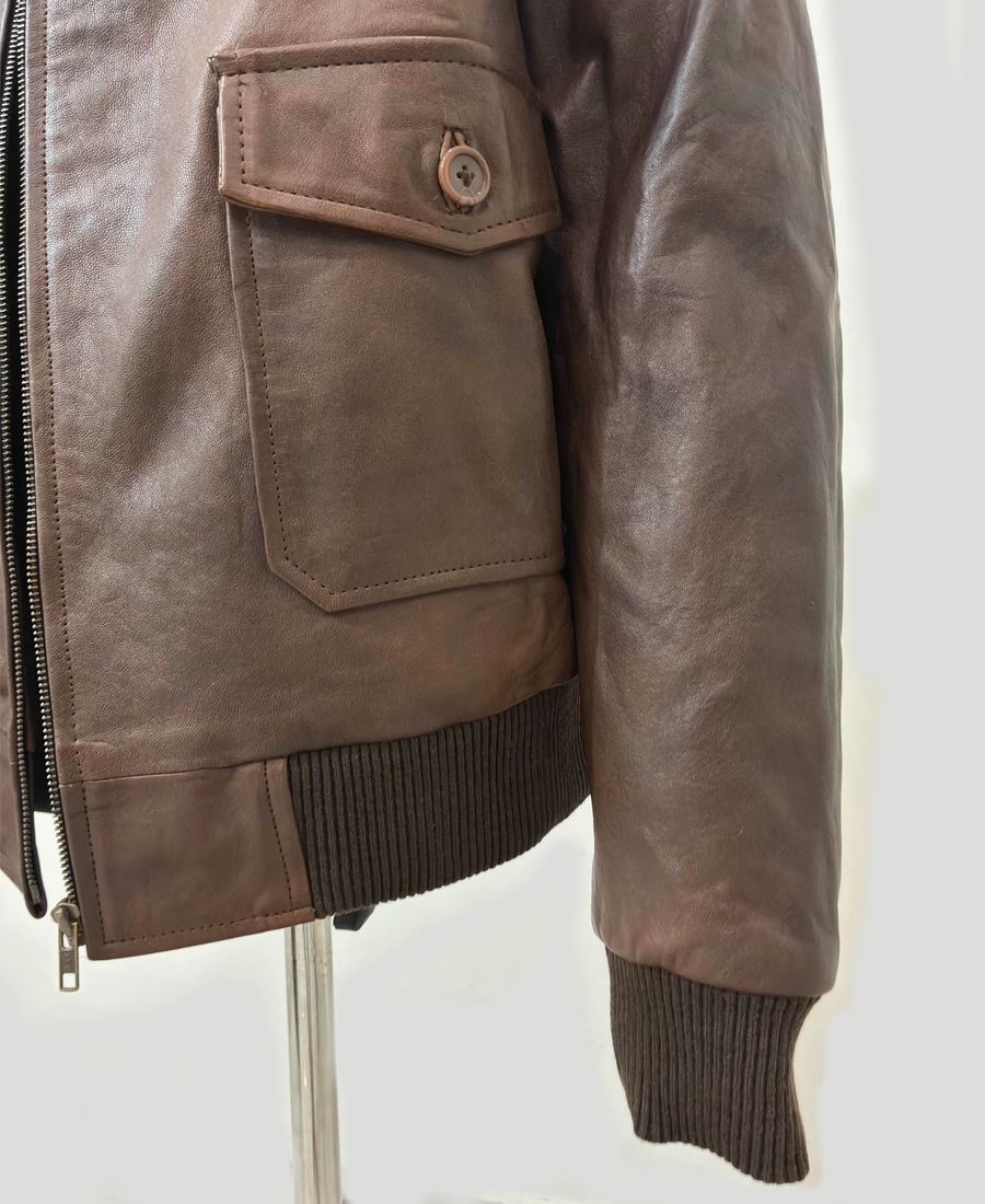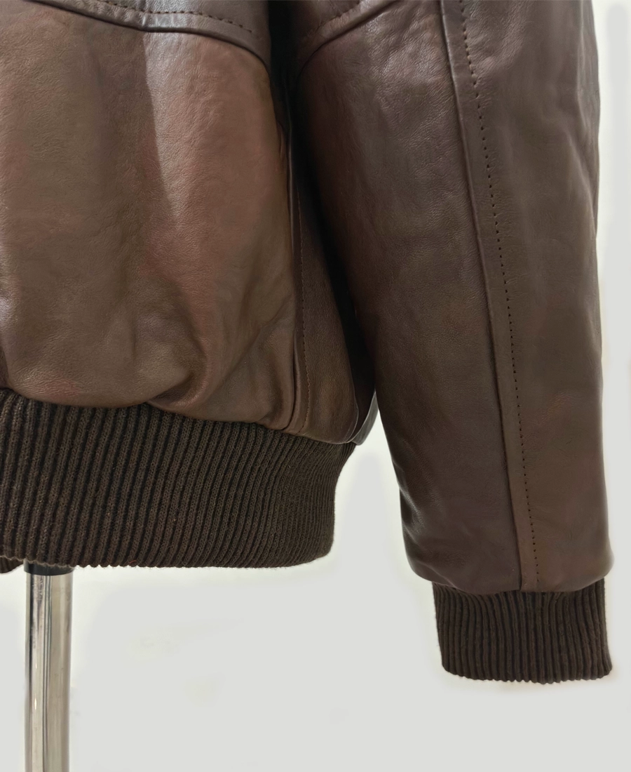 Crafted from premium genuine leather, this bomber jacket exudes durability and sophistication with a rugged edge. Its rich texture develops a unique patina over time, ensuring each piece tells its own story. The structured design features a pointed shirt-style collar, rib-knit cuffs and hem, and a zip-front closure, staying true to the jacket’s authentic silhouette.