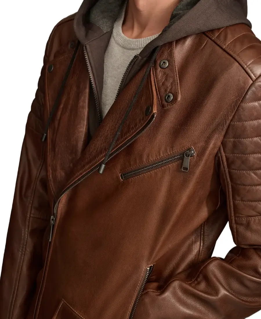 The Andres Moto Leather Jacket is made from real leather with a bold red and black color combination that gives it a strong motorcycle inspired look. It features an erect collar along with an adjustable drawstring hood that adds extra coverage and a sporty touch. The front comes with a zipped closure for secure fastening, while the full length sleeves include zipped cuffs that provide a firm grip around the wrists. The inside includes viscose lining for comfortable wear throughout the day. Designed with two side pockets, this jacket offers space for carrying small everyday essentials while keeping a sharp moto style.