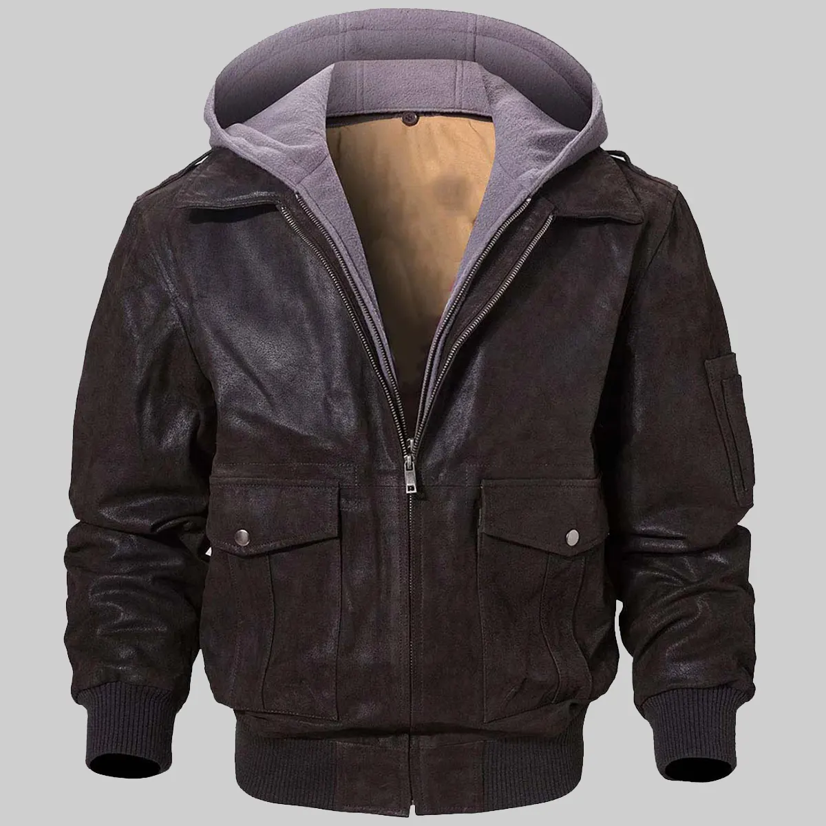 Andrew Mens Dark Brown Bomber Hooded Leather Jacket