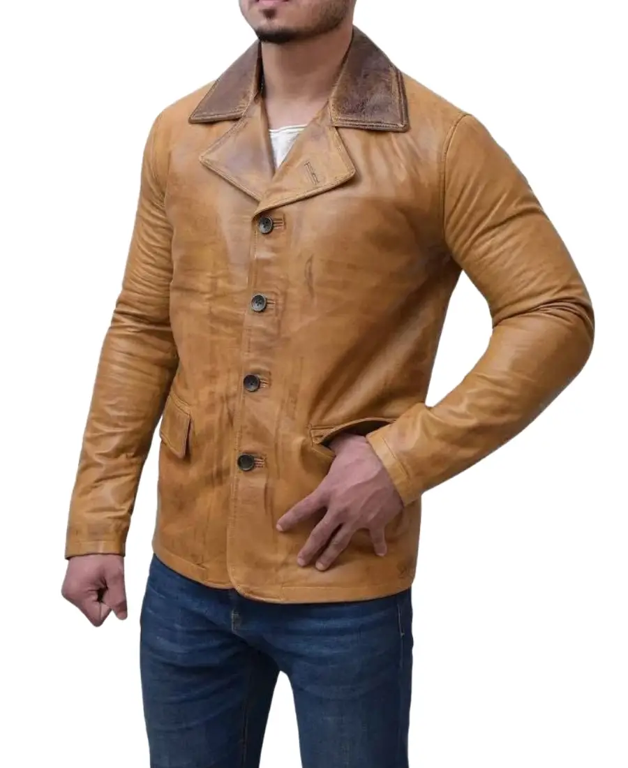 The Arthur RDR Brown Leather Coat is crafted from genuine leather and finished in a rich brown shade inspired by rugged western style. It features a lapel style collar that adds a classic frontier touch, along with a button front closure for secure fastening and traditional detailing. Full length sleeves with open hem cuffs provide a relaxed and comfortable fit, while the soft viscose lining on the inside ensures ease during extended wear. Designed with two front flap pockets, this coat offers practical space for essentials while capturing a bold, outlaw inspired look that stands out in any wardrobe.