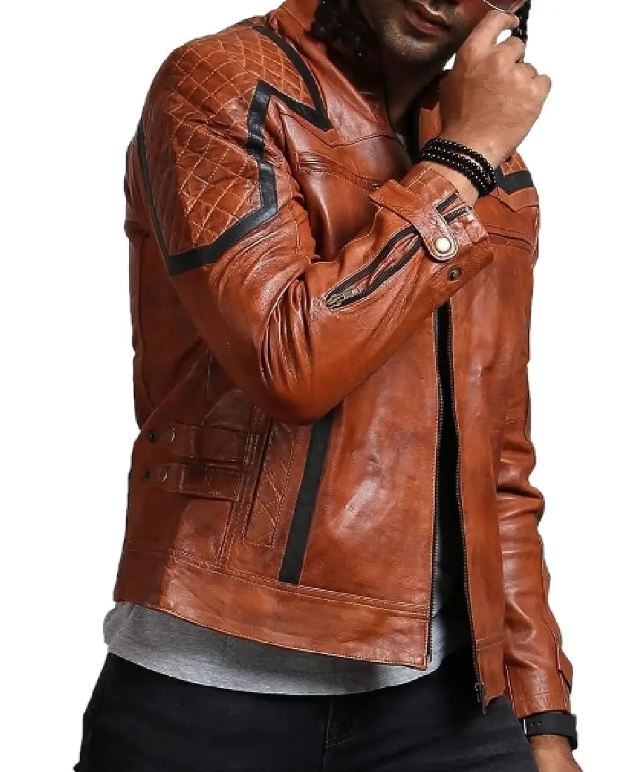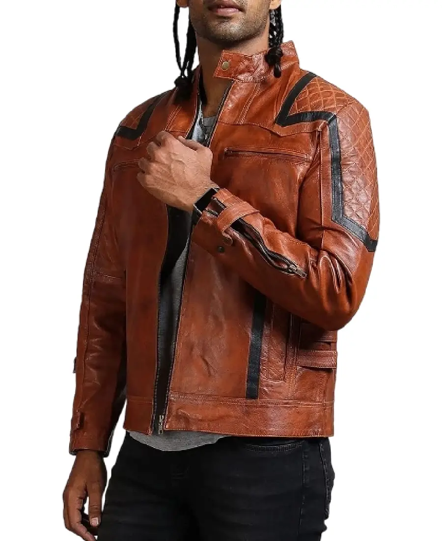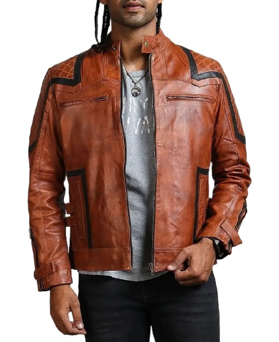 The Bellagio Vintage Brown Biker Jacket is made from soft sheepskin leather that gives it a distinctive and rich texture. Inside, the viscose lining provides a comfortable layer that helps keep you warm when worn. The erect collar adds a bold touch and stands upright for added style. The cuffs feature both zipper and snap button closures allowing for adjustable fit and a secure feel around the wrists. The jacket closes with a strong zipper at the front making it easy to wear and remove. Full-length sleeves offer complete protection for the arms. With four front pockets there is plenty of room to carry essentials while two inner pockets provide extra space for valuables. The brown color highlights the vintage style giving this jacket character and a timeless appeal. This jacket combines quality materials with thoughtful details to create a distinctive look and practical wearability.