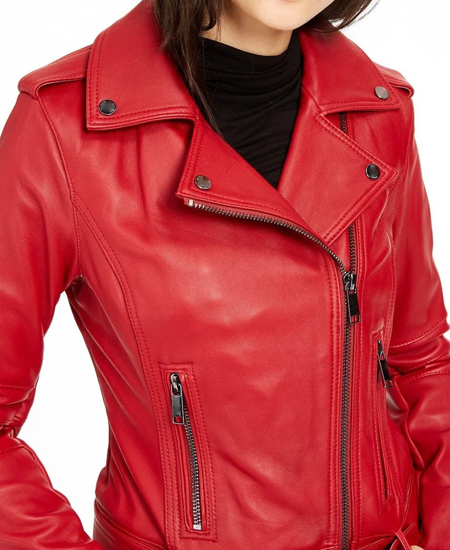 Featuring a vibrant red color this biker jacket is made of genuine leather which gives it a sturdy and authentic feel. Inside the jacket a viscose lining provides a comfortable layer that helps keep the temperature balanced. The notch collar adds a distinct style while the open hem cuffs give a relaxed fit at the wrists. The jacket closes with both a zipper and a belt offering added security and a customizable fit. Full length sleeves provide complete arm coverage. Two side pockets make it easy to carry essentials and two inner pockets offer additional space for valuables. The waist-length design enhances mobility and adds to its bold appearance. This jacket combines practical features with a striking look making it a great choice for those wanting to stand out.