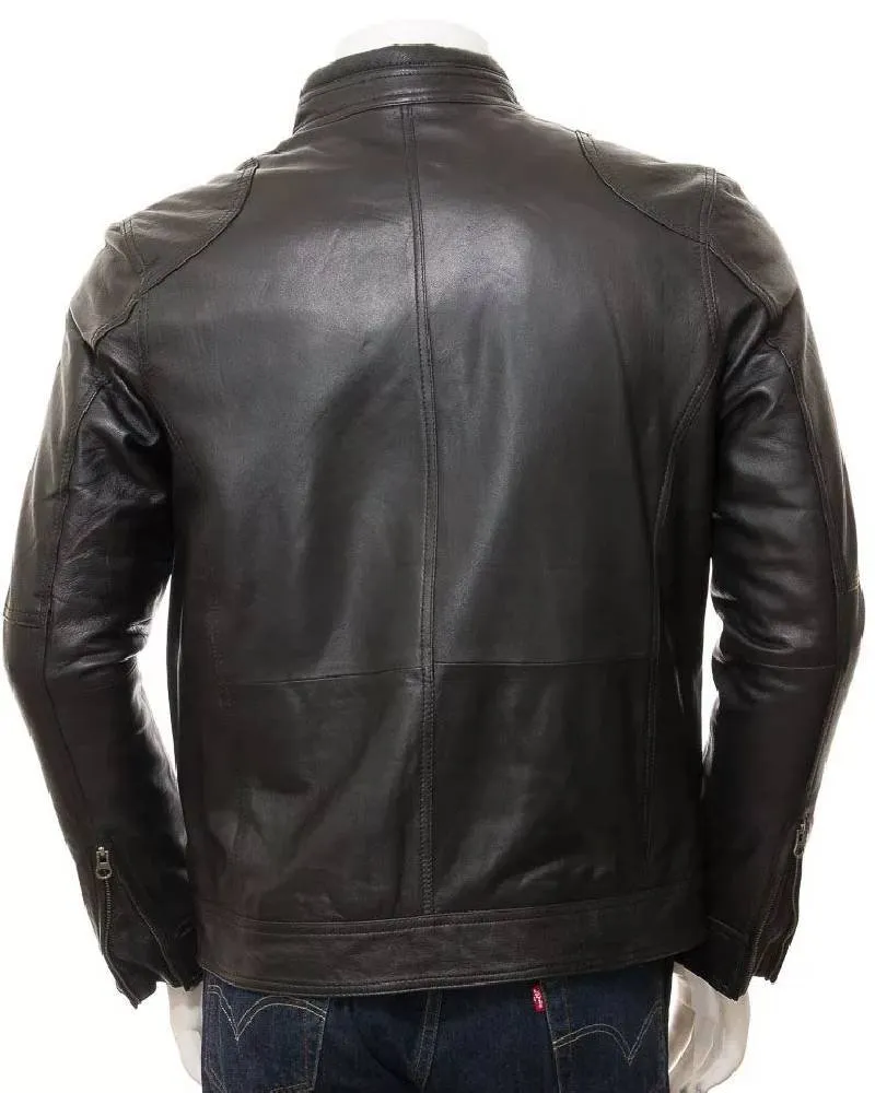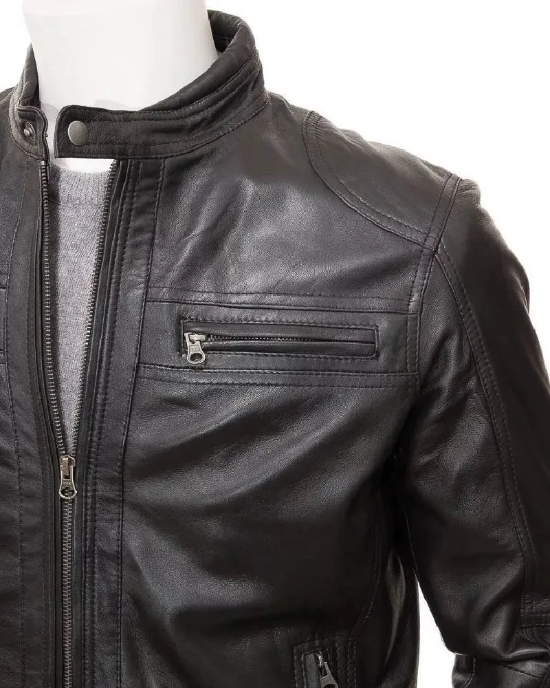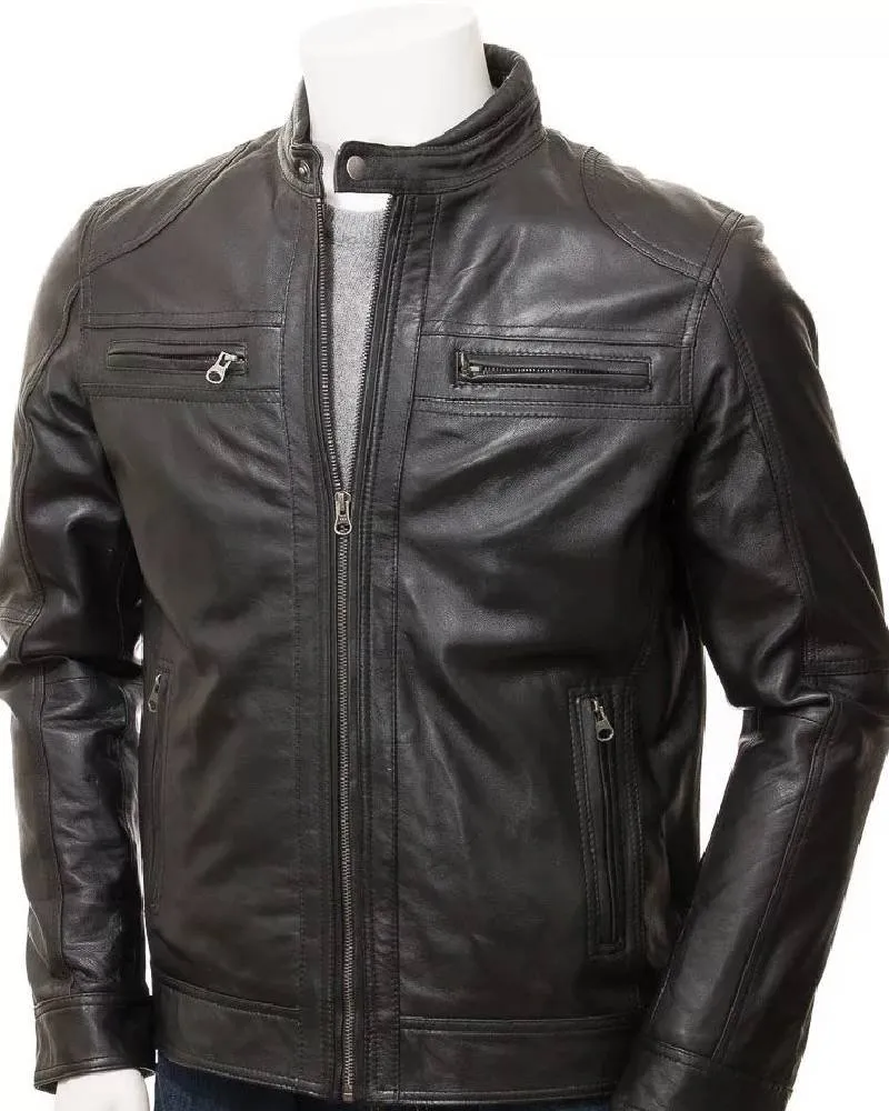 Black Leather Double Pockets Biker Jacket Men’s
