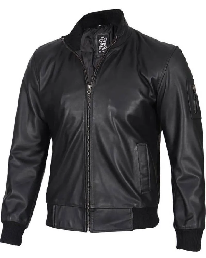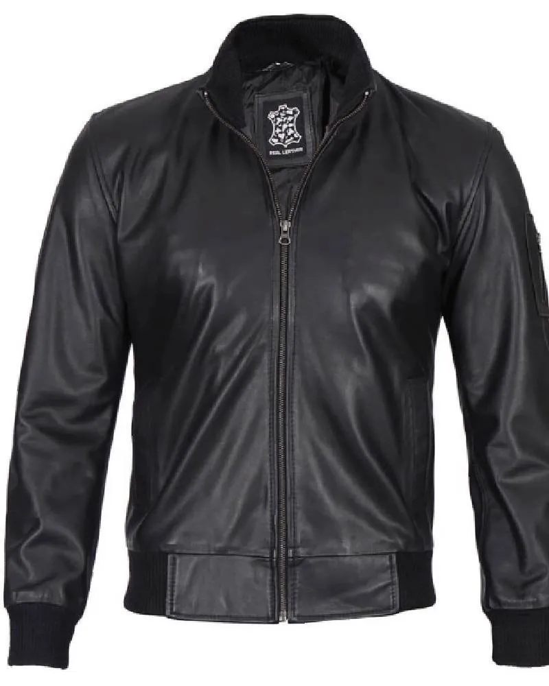 Black Real Cowhide Leather Bomber Jacket Mens