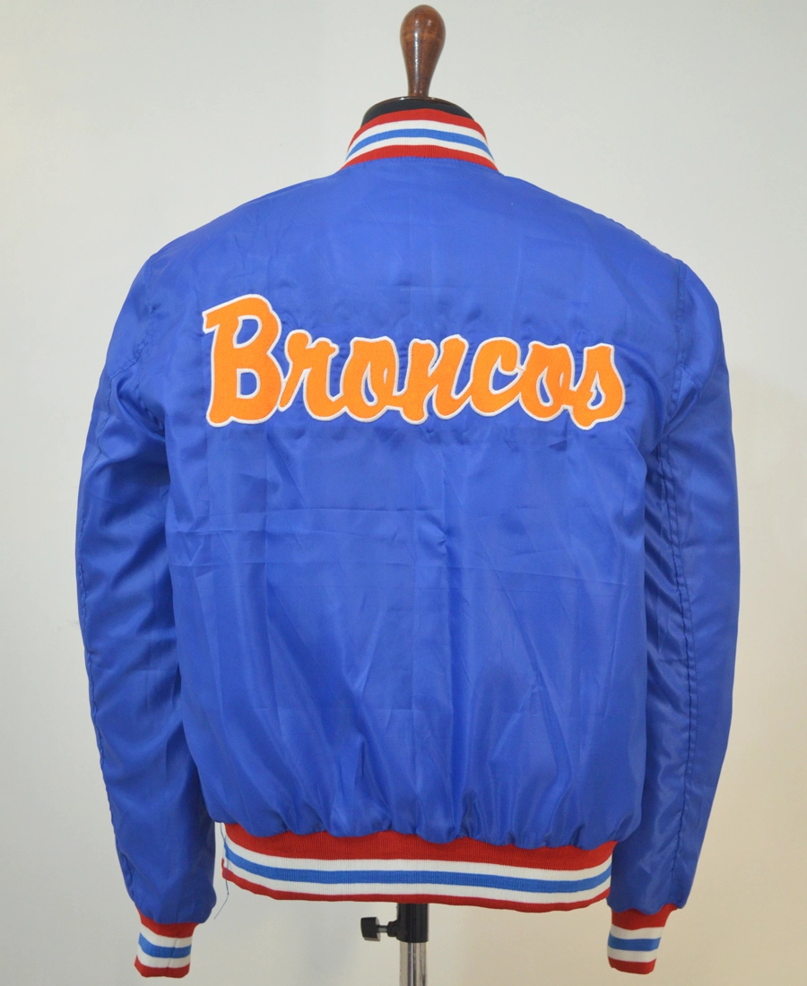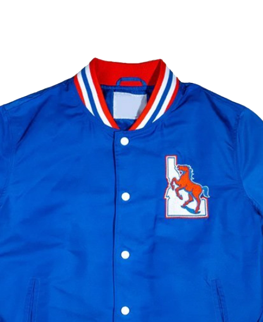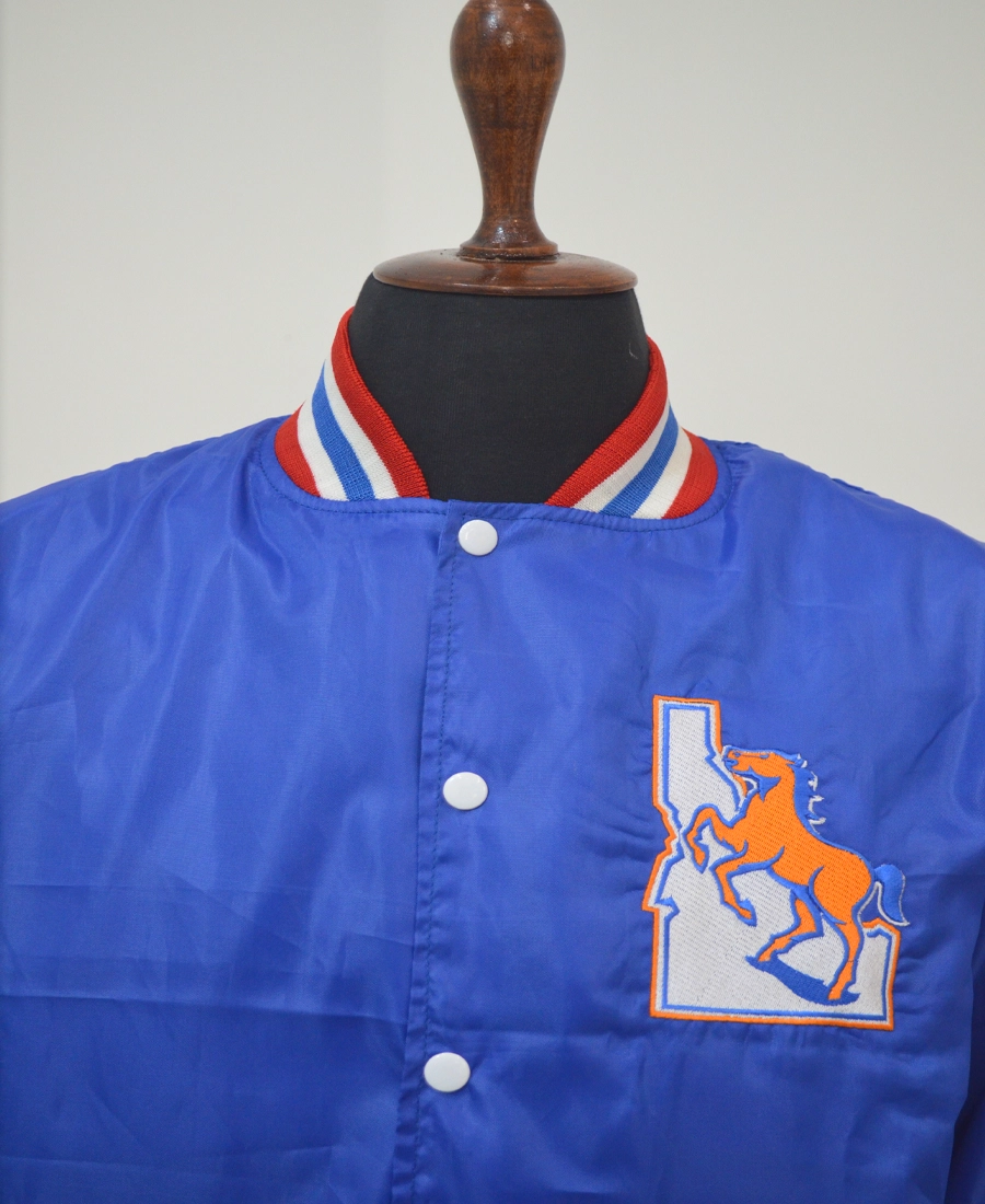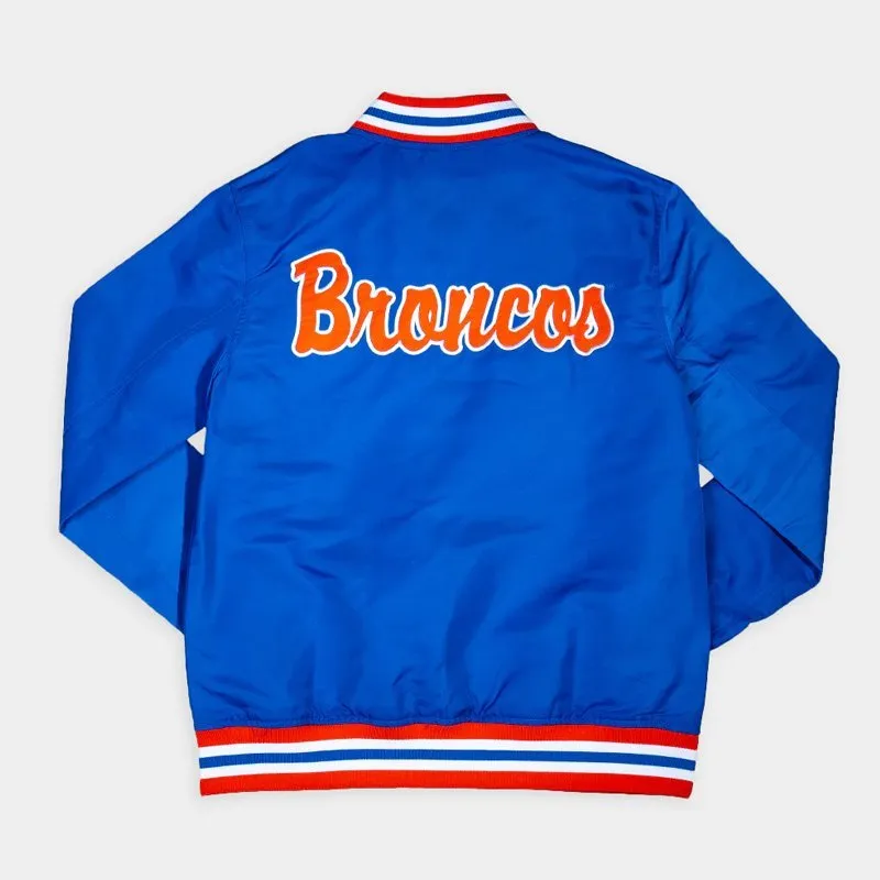 Crafted from premium materials, the jacket features a smooth, durable shell with a comfortable inner lining for all-day wear. The standout detail is the vintage Boise State Broncos logo, embroidered or appliquéd to perfection, evoking the nostalgia of classic college sports. Team colors in vibrant blue and orange run throughout the design, with striped rib-knit collar, cuffs, and hem adding to its authentic varsity-inspired look.