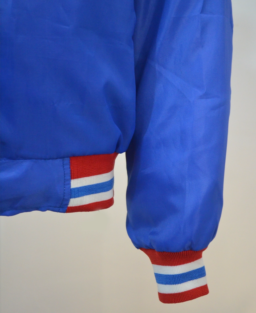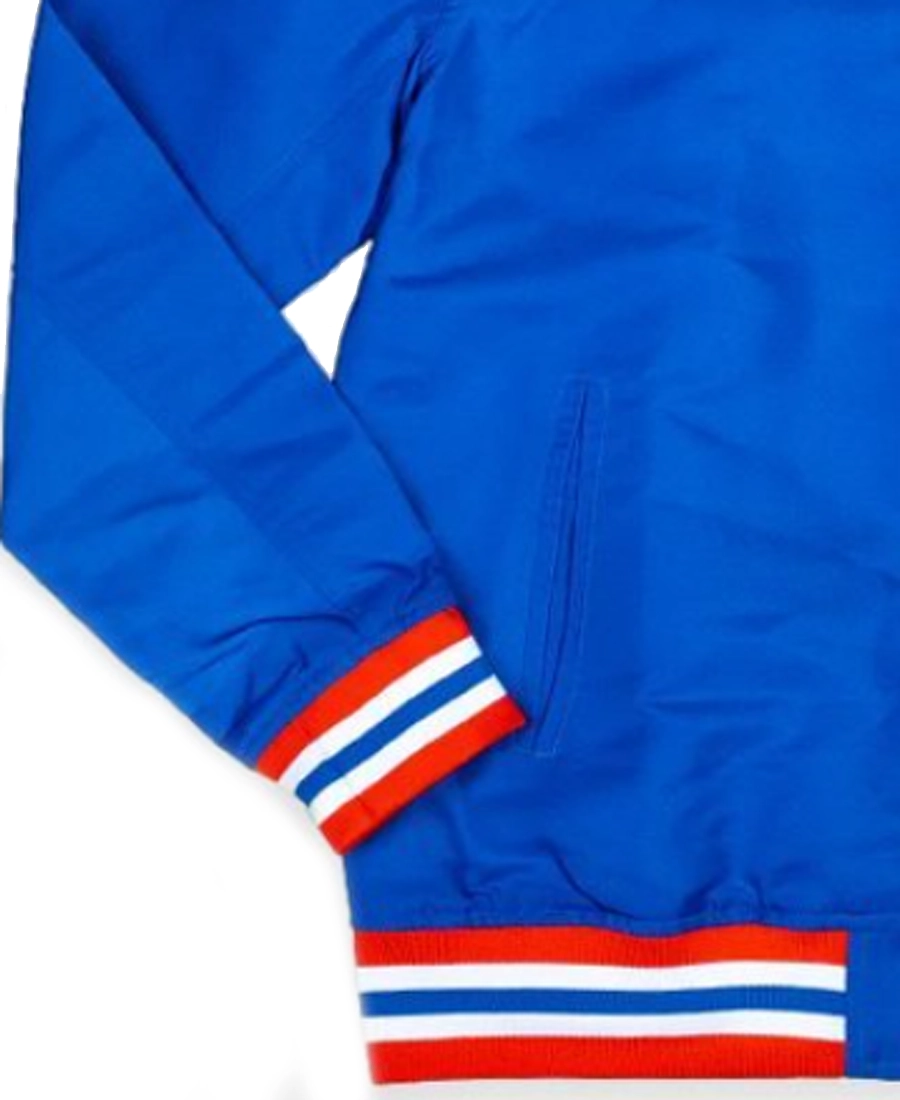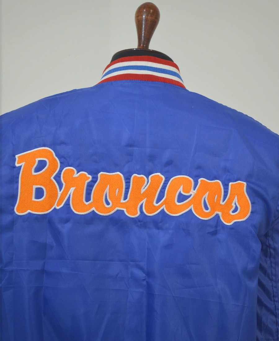 Crafted from premium materials, the jacket features a smooth, durable shell with a comfortable inner lining for all-day wear. The standout detail is the vintage Boise State Broncos logo, embroidered or appliquéd to perfection, evoking the nostalgia of classic college sports. Team colors in vibrant blue and orange run throughout the design, with striped rib-knit collar, cuffs, and hem adding to its authentic varsity-inspired look.