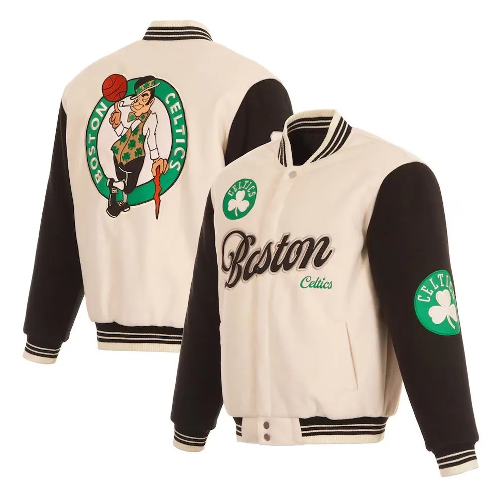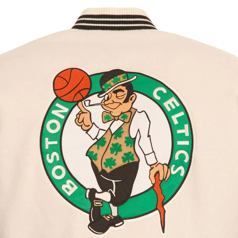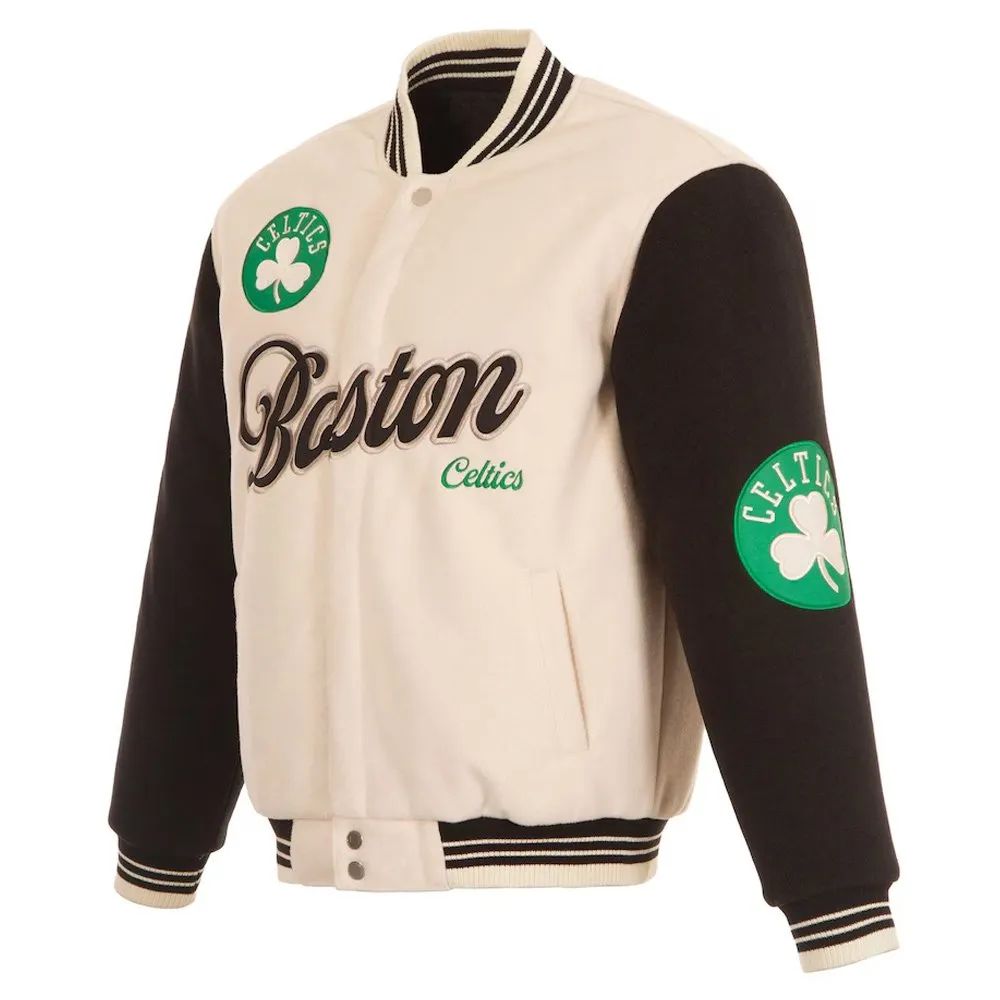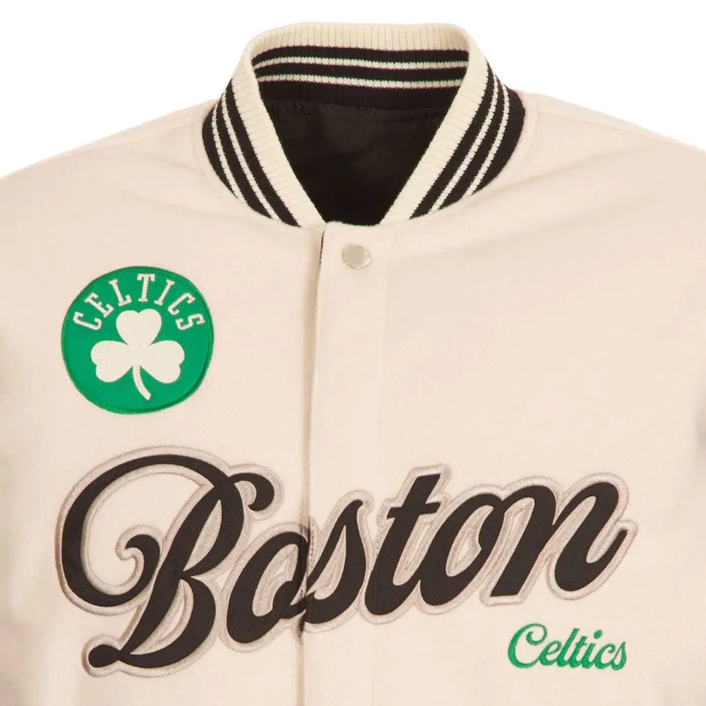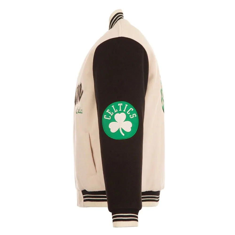 Shop The Boston Celtics Cream and Black Varsity Jacket
