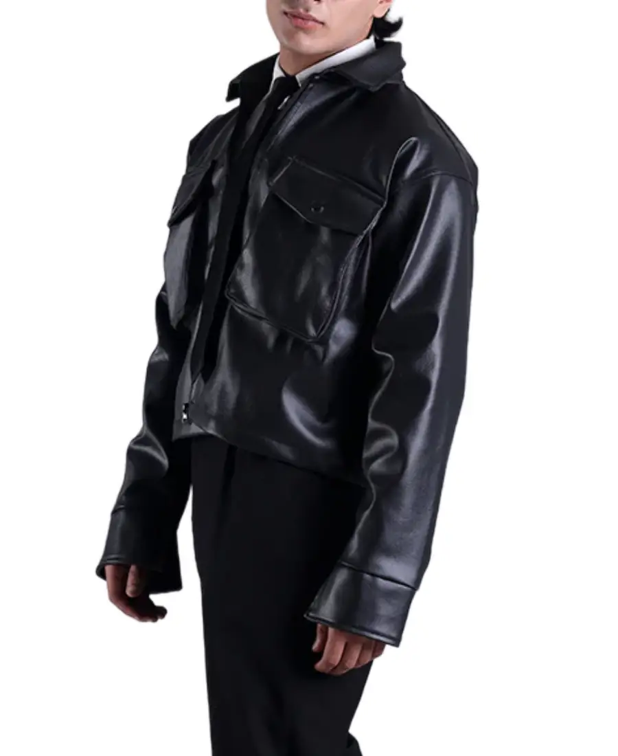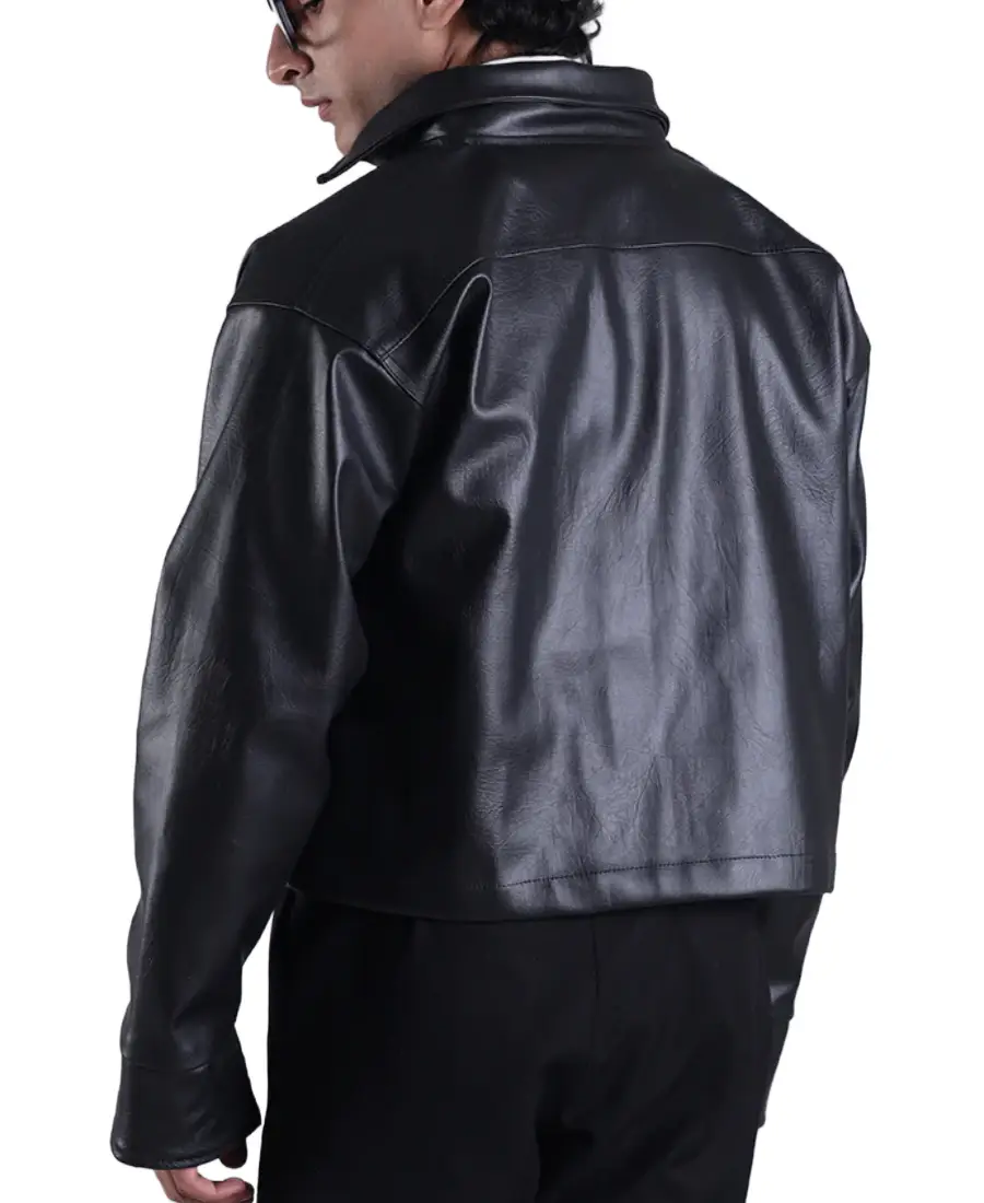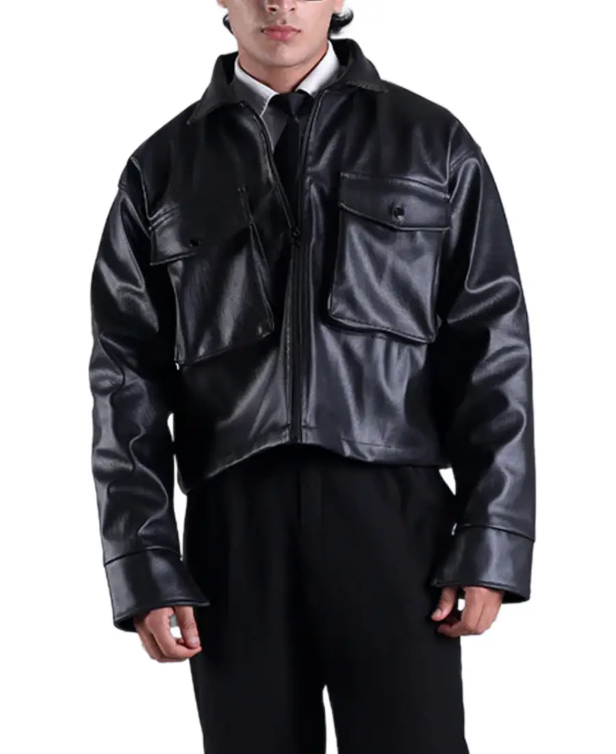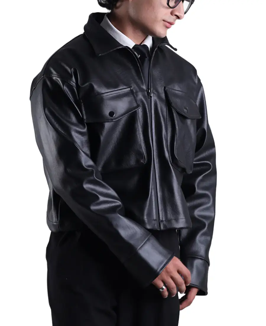 The Classic Black Cropped Leather Jacket delivers a sharp modern look with a flattering shorter cut. Made from real leather it offers a sturdy feel that becomes more distinctive with regular wear. The cropped length sits neatly at the waist making it easy to style with high rise jeans skirts or fitted trousers. A shirt style collar adds a structured touch at the neckline while the front zipper closure keeps the jacket secure and easy to adjust. Full length sleeves with open hem cuffs allow comfortable movement and give a relaxed finish at the wrists. The viscose lining provides a soft layer inside making it suitable for extended wear. Two chest pockets add functional detail and practical space for small essentials. The black color keeps the design strong and confident making it a go to piece for casual outings and evening looks alike.