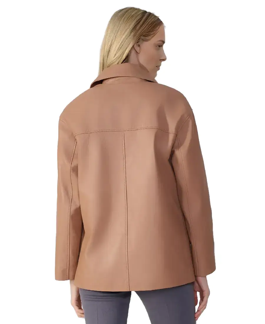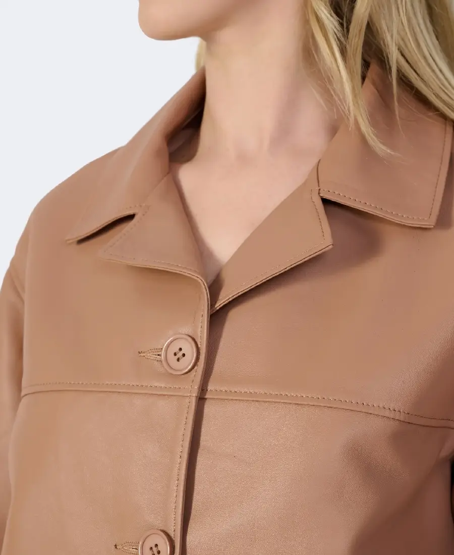 The Colette Light Brown Leather Jacket is a refined everyday piece that blends classic design with a warm natural tone. Made from real leather it offers a durable feel that becomes more distinctive with time and wear. The shirt style collar gives it a clean and structured appearance while the button closure down the front keeps the look balanced and easy to style. Full length sleeves with open hem cuffs create a relaxed finish that works well for layering during cooler days. Inside, the viscose lining adds a soft touch against the skin and makes it comfortable for long hours of wear. Two waist pockets provide convenient space for daily essentials and an inner pocket keeps smaller items secure. The light brown color brings a grounded and versatile look that