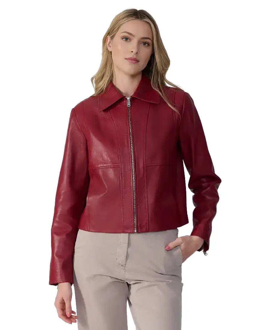 The Daisy Women Red Leather Jacket is designed for those who like to stand out while keeping a refined look. Made from real leather it has a sturdy texture that feels reliable and gains character over time. The shirt style collar gives it a neat outline around the neckline while the front zipper closure keeps the fit secure and easy to manage. Full length sleeves are finished with open hem faux shearling cuffs that add a soft contrast against the vibrant red exterior. Inside, the viscose lining provides a gentle layer that makes it suitable for extended wear in cooler weather. Two side pockets offer space for carrying small essentials while keeping the silhouette clean and balanced. The rich red color brings energy to any outfit making it a striking
