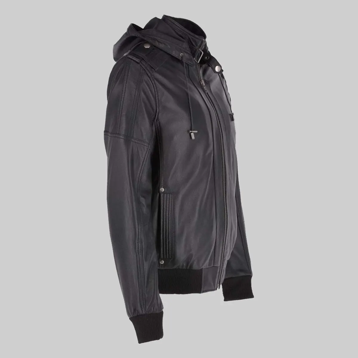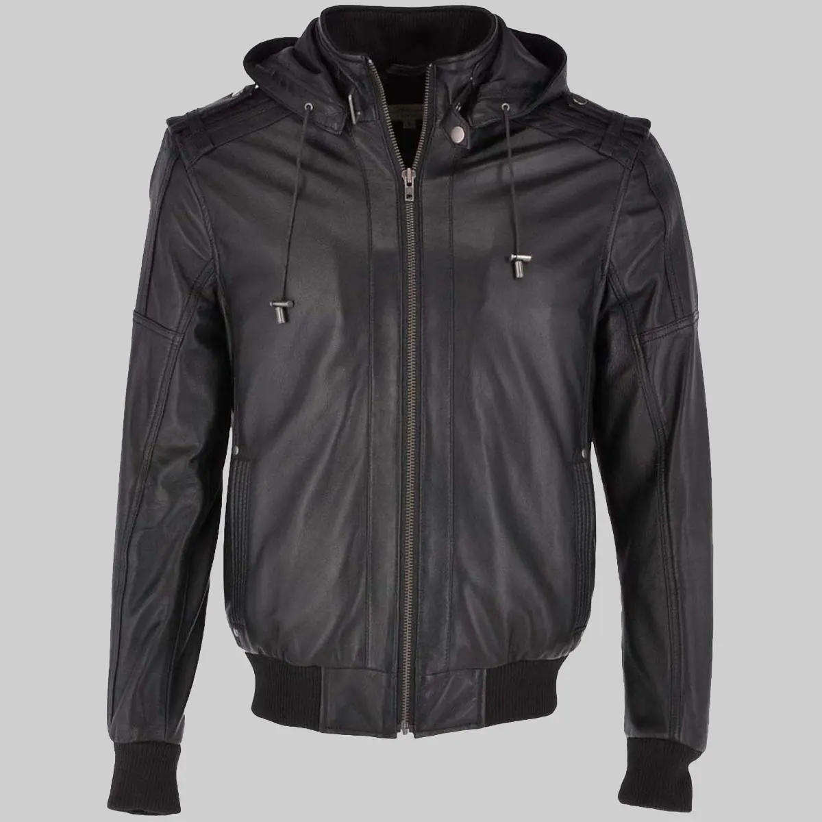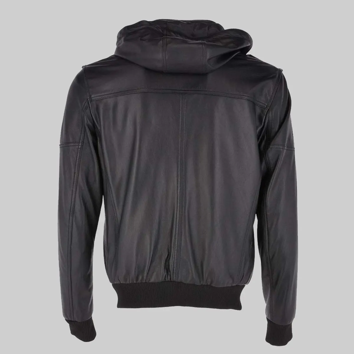 Eddison Mens Black Bomber Hooded Leather Jacket