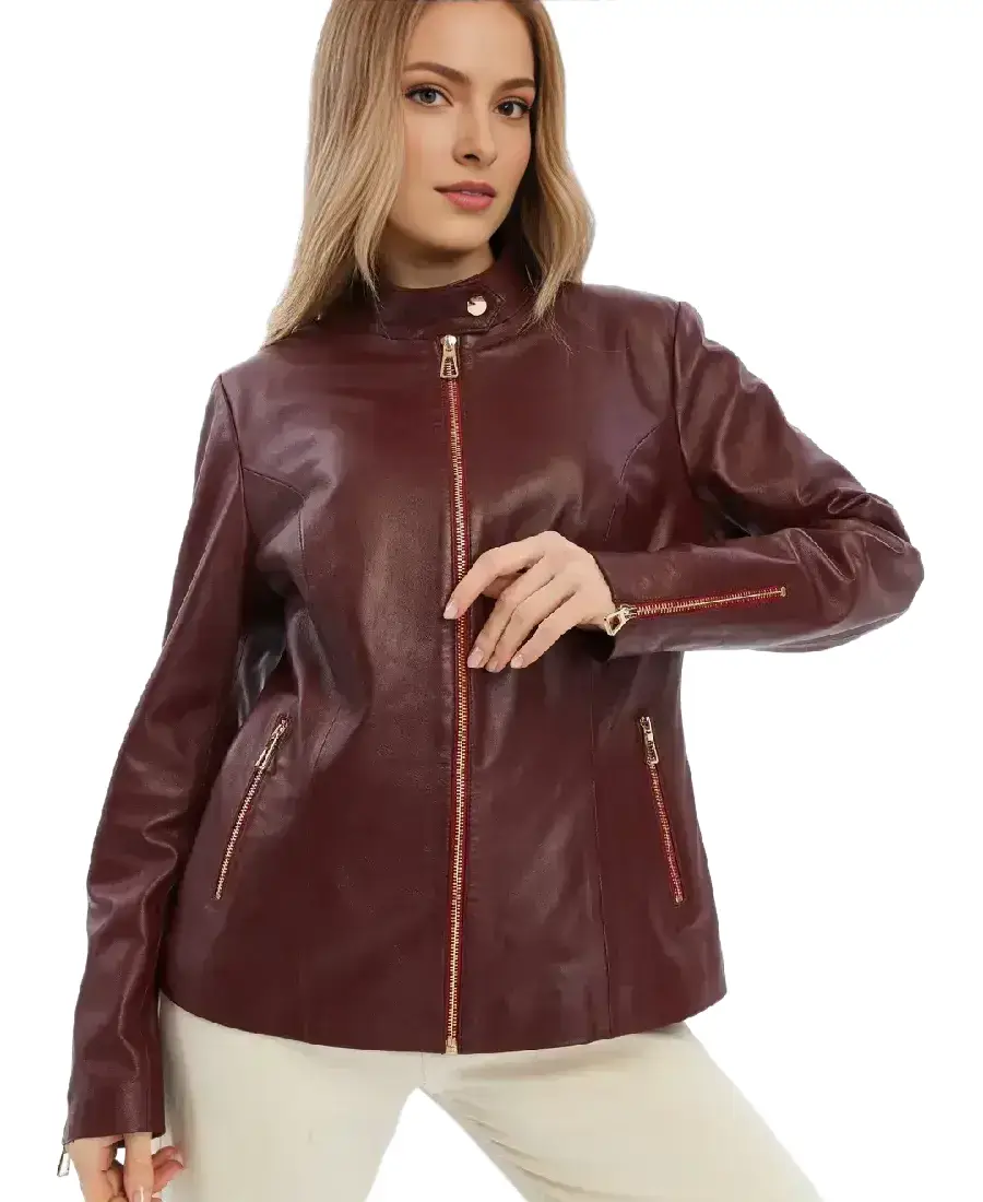 The Elspeth Women Burgundy Leather Jacket has a rich deep color that immediately adds warmth and character to any outfit. Made from real leather it carries a firm texture that softens over time and gives each jacket a unique personality. The erect collar frames the neck with a structured look while the front zipper closure offers a secure fit that is easy to wear. Full length sleeves with zipper cuffs allow you to adjust the fit at the wrists and add a subtle detail to the overall design. Two side pockets provide convenient space for small items while keeping the jacket sleek and functional. Inside, the viscose lining ensures the jacket drapes nicely over layers and makes it suitable for longer wear. This piece is ideal for city strolls casual gatherings or evening outings and brings a refined sense of style without feeling overdone.