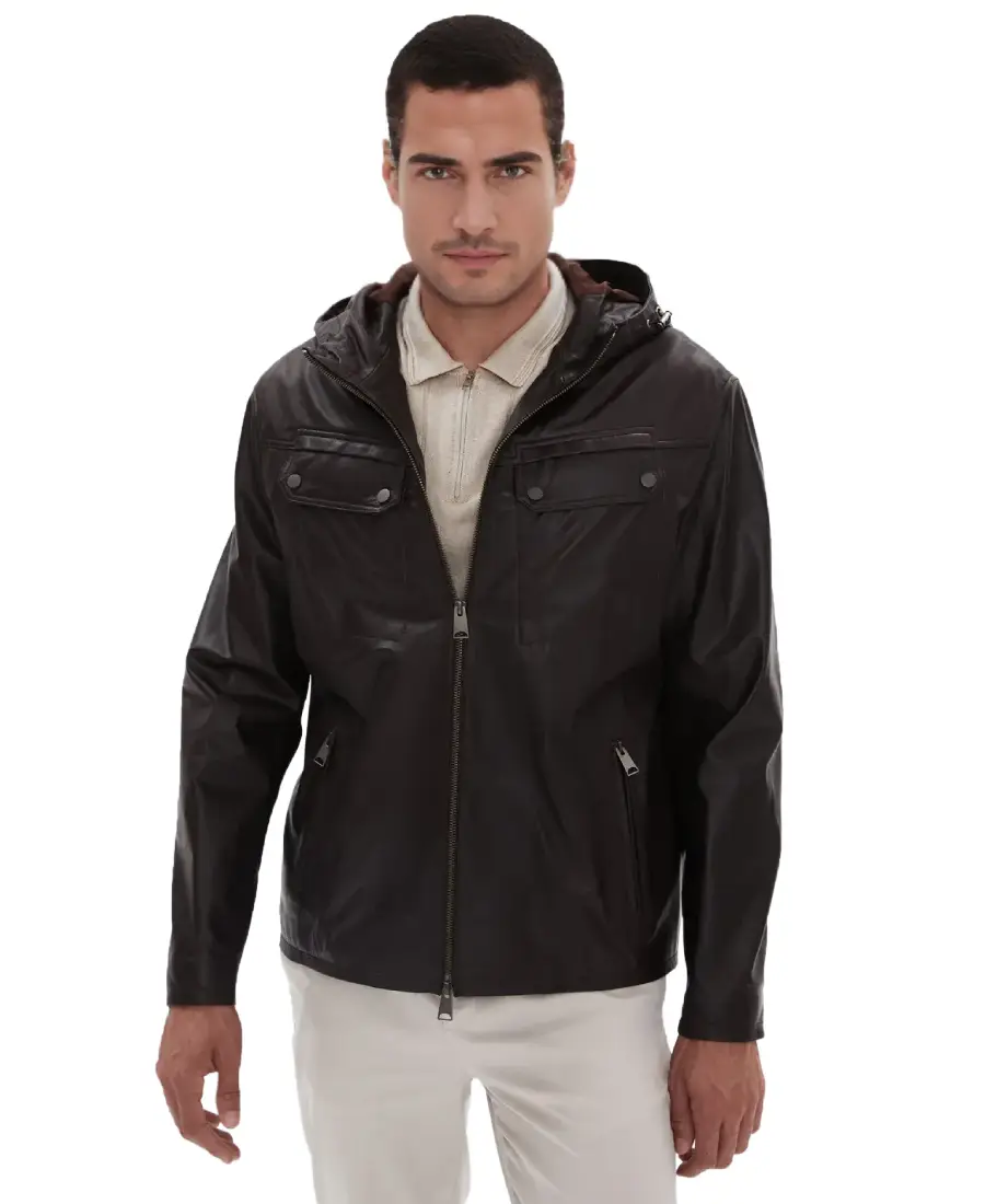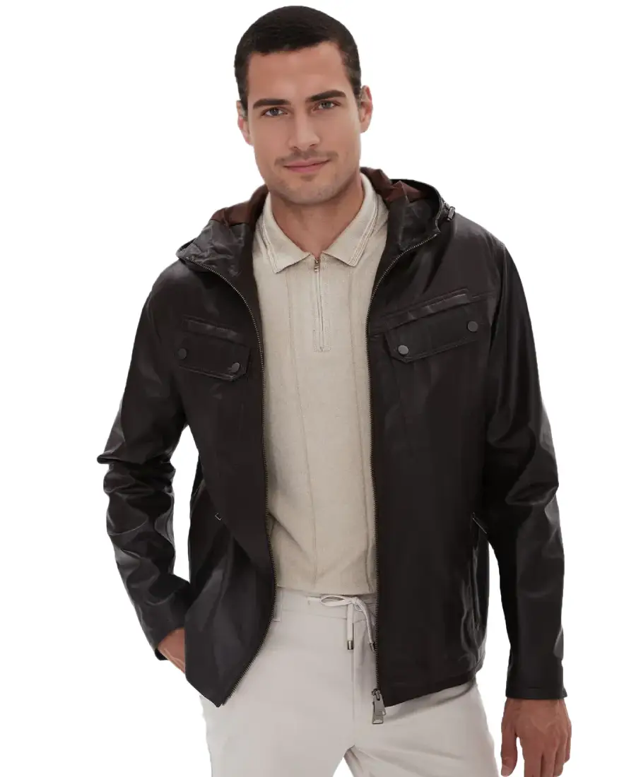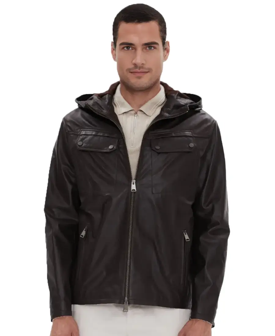 The Horace Hooded Leather Jacket is designed for everyday wear with a practical touch for changing weather. Made from real leather it offers a sturdy feel that holds its shape while gradually adapting to the body. The adjustable hood adds extra coverage and makes it suitable for cooler or windy days. A front zipper closure keeps the jacket secure and gives it a straightforward finish. Full length sleeves with open hem cuffs allow natural movement and a relaxed fit at the wrists. The viscose lining provides a soft layer against the skin making it comfortable for long hours. Two side pockets offer convenient space for daily essentials while two chest pockets add extra storage and a functional detail. The dark brown color gives it a grounded and confident look that pairs well with denim boots and layered casual outfits.