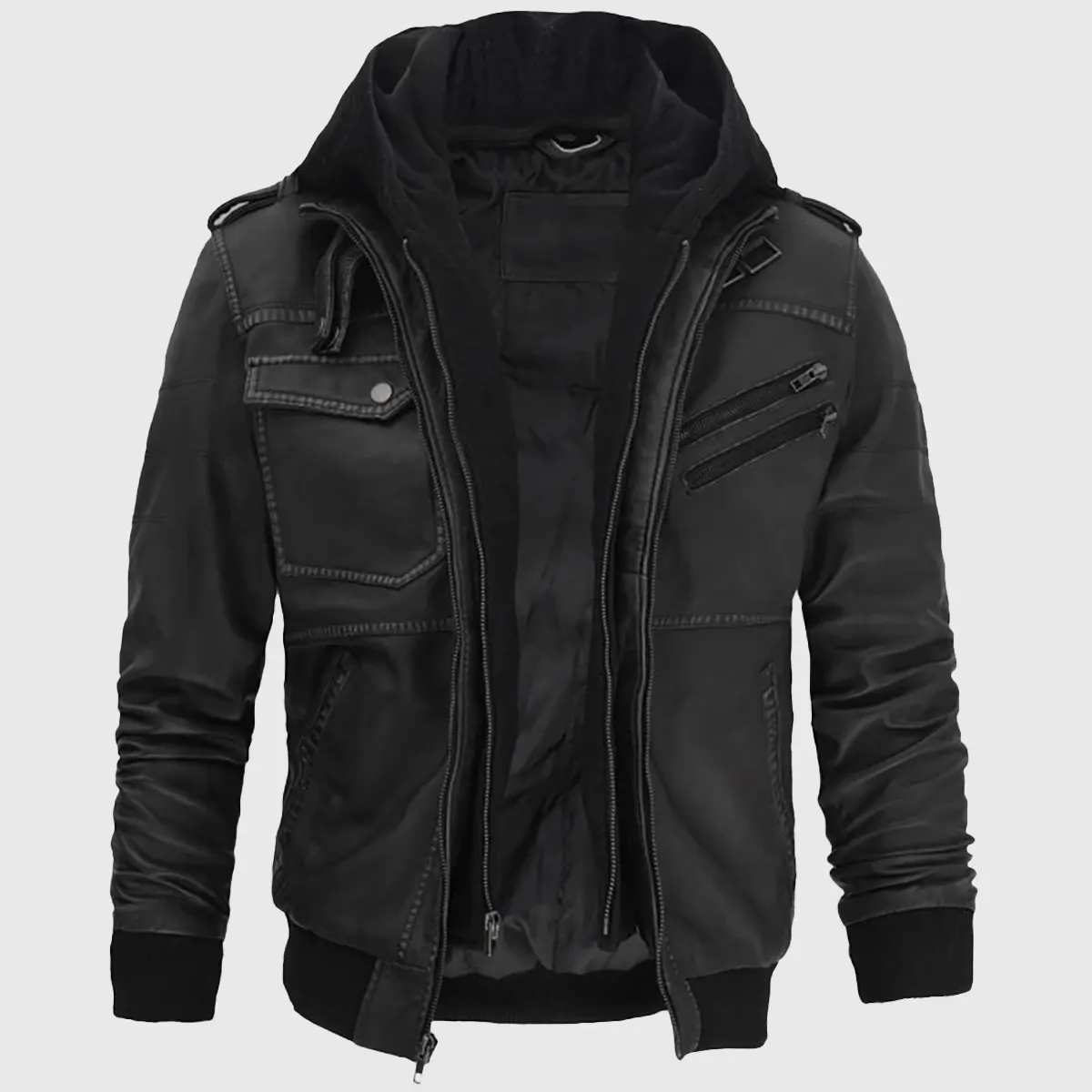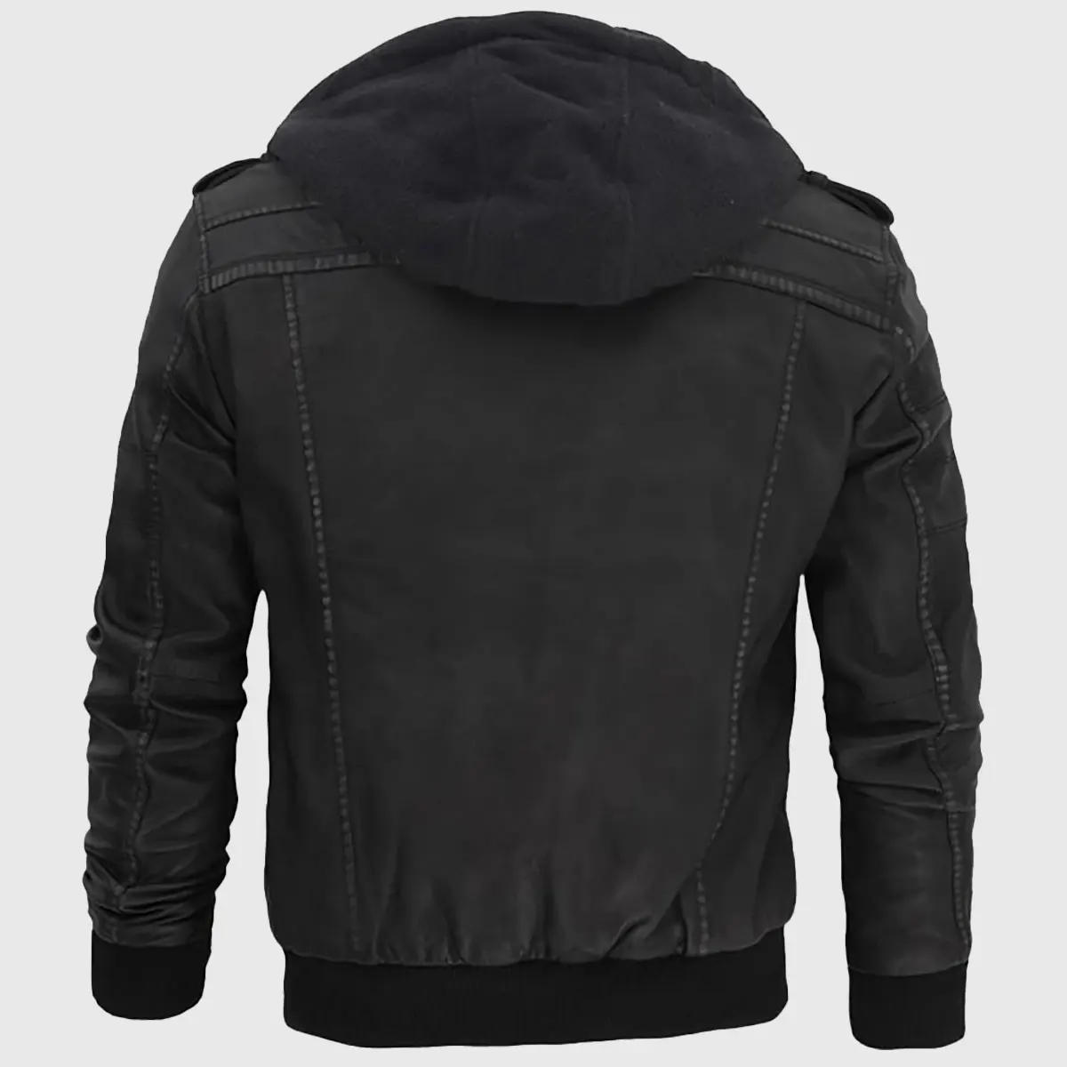 Jacey Men’s Black Hooded Bomber Leather Jacket