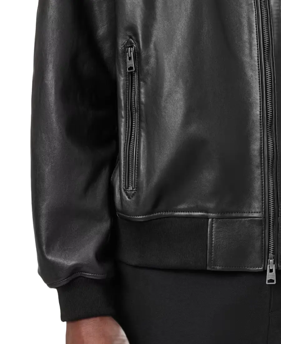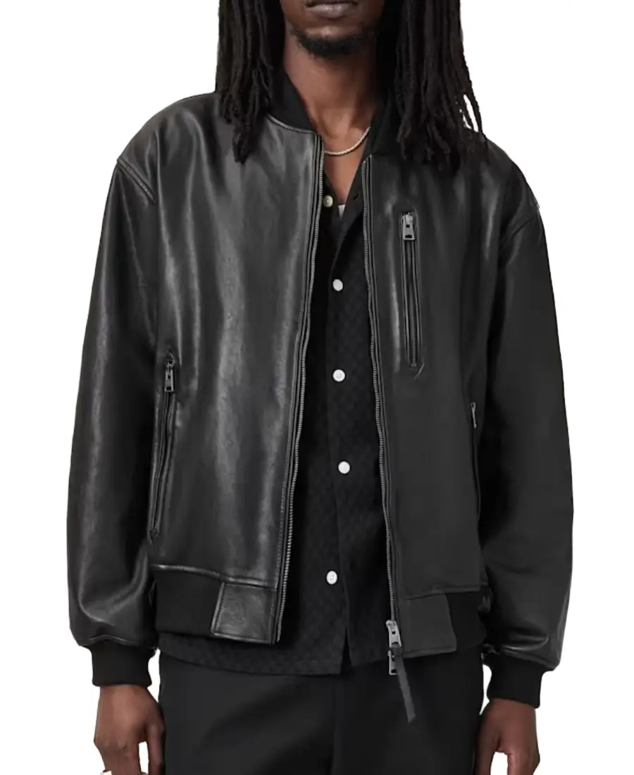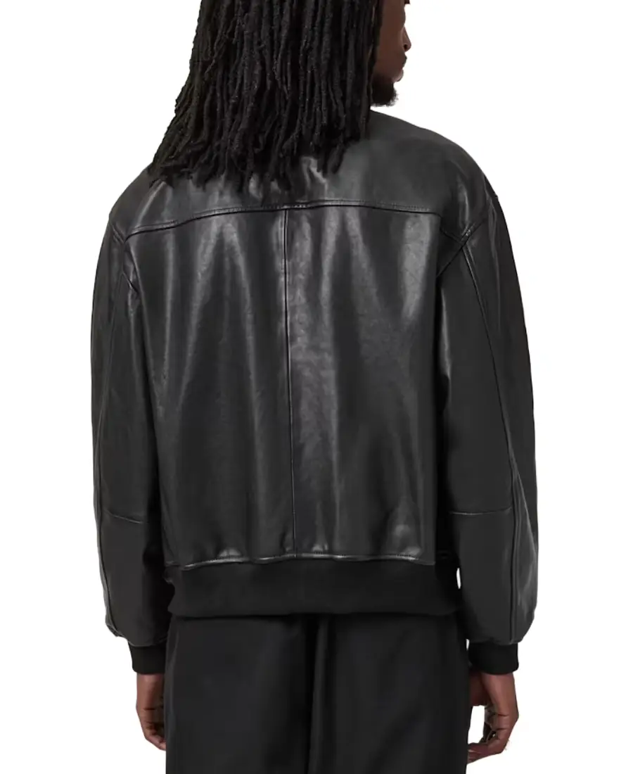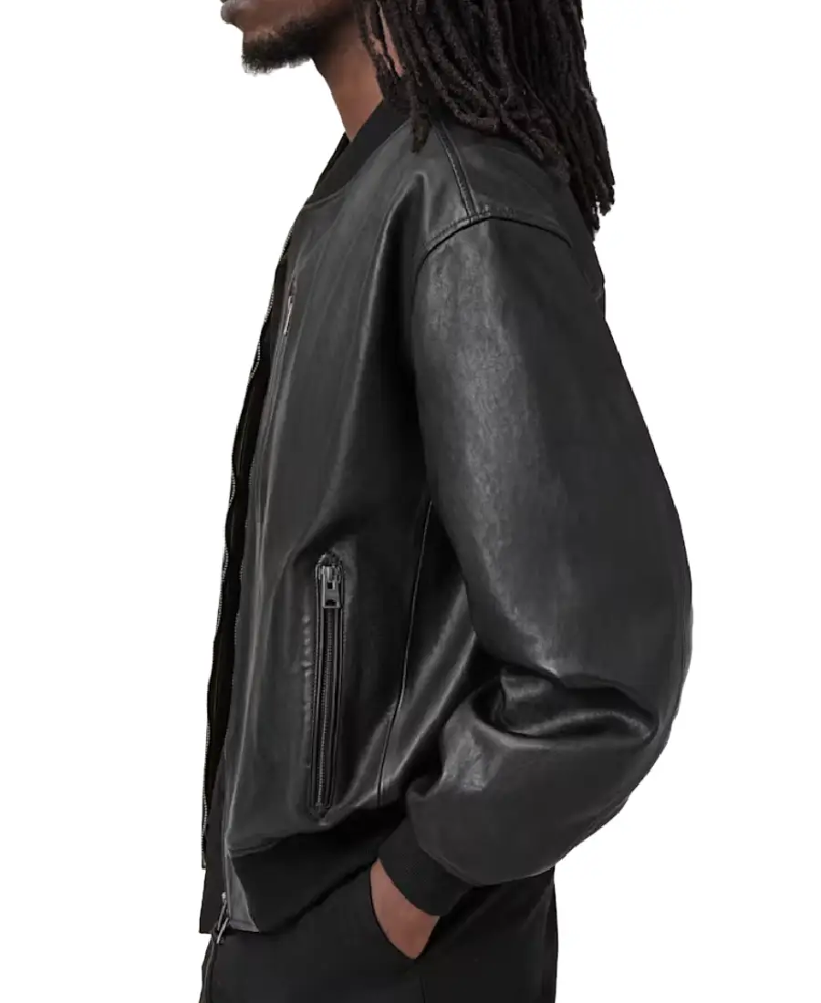 The Kino Oversized Leather Bomber Jacket is made from real leather in a black color that gives it a bold and modern look. It features a ribbed collar that adds the classic bomber jacket style, along with a front zipped closure for easy wear. The oversized design creates a relaxed feel while still keeping the strong leather appearance. Full length sleeves are finished with ribbed cuffs that sit comfortably at the wrists. The inside includes viscose lining that feels smooth while wearing. Two side pockets and one chest pocket provide space for everyday essentials while keeping the bomber style clean and sharp.
