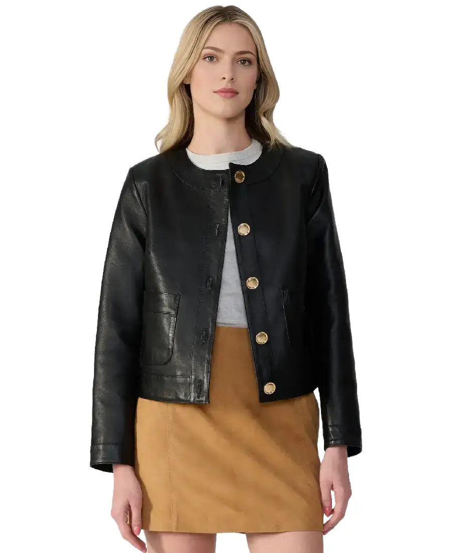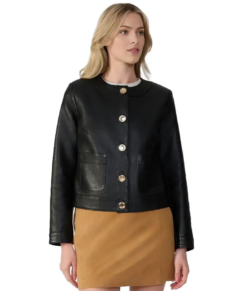 The Margot Black Leather Jacket offers a classic yet striking look for everyday wear. Made from real leather it has a firm texture that softens naturally over time and adapts to the body. The front button closure keeps the jacket secure and gives it a neat and structured finish while full length sleeves with open hem cuffs provide ease of movement and a relaxed touch. Inside, the viscose lining ensures a soft layer against the skin making it comfortable for extended wear. Two waist pockets offer practical space for small essentials without disrupting the clean silhouette. The deep black color gives the jacket a strong presence that pairs well with casual jeans boots or layered outfits for a confident appearance.