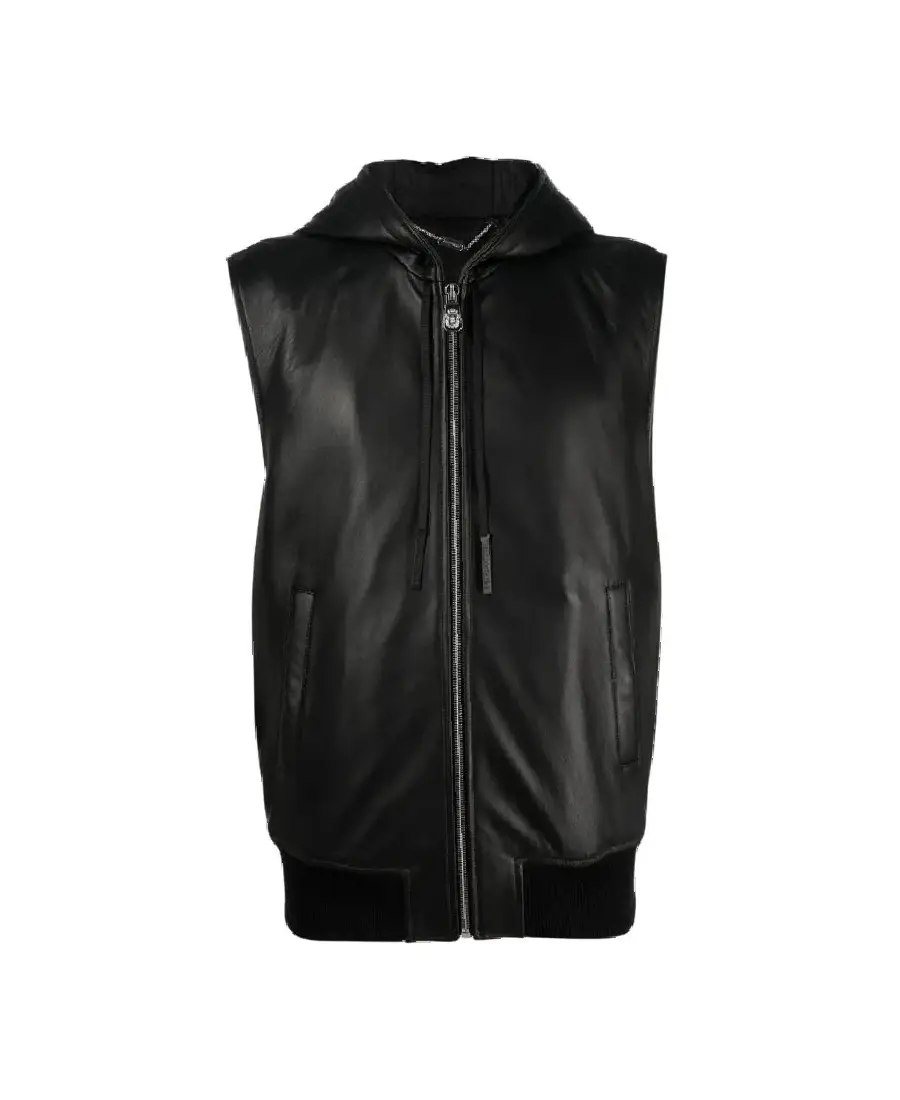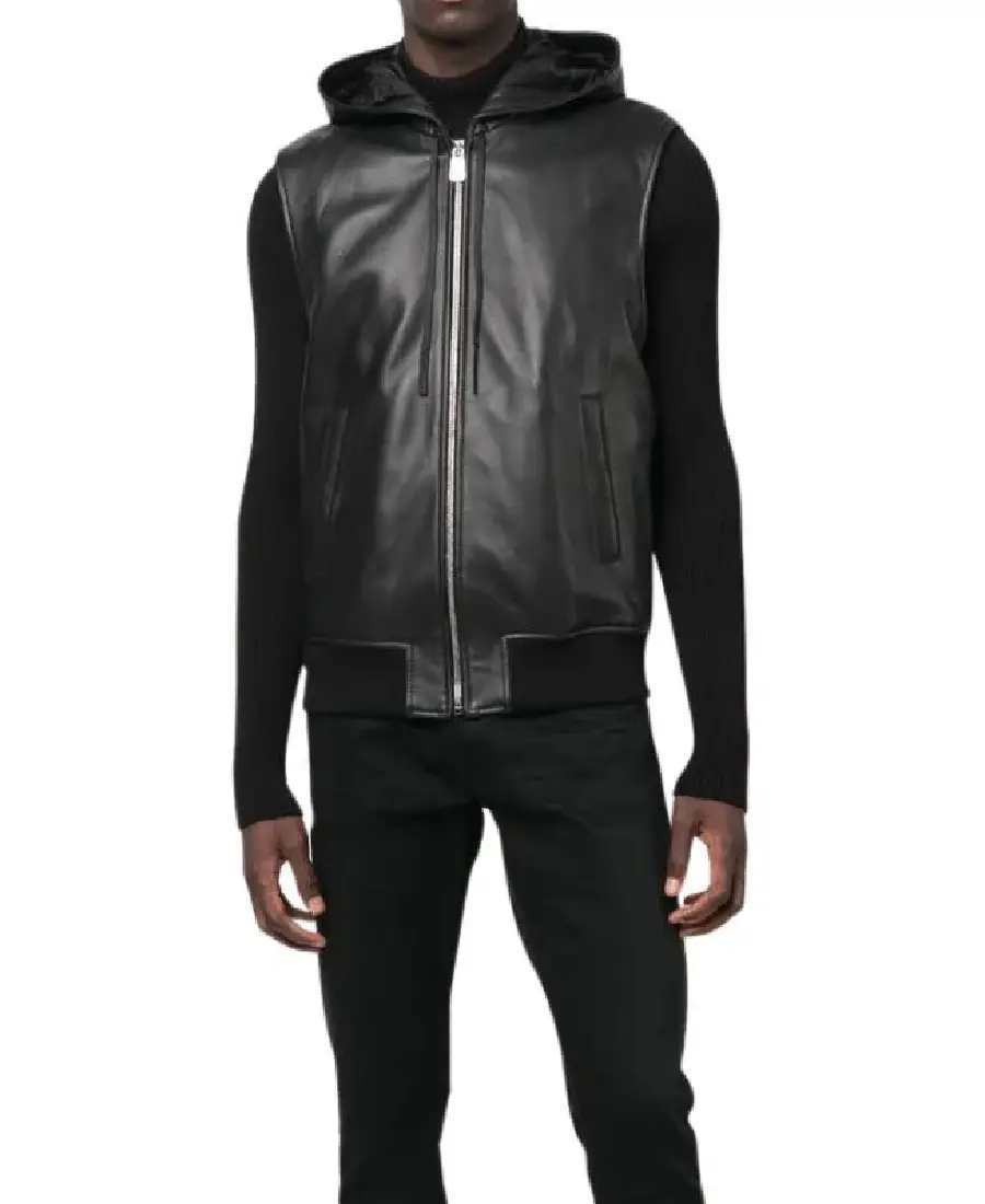 Men Black Hooded Leather Vest