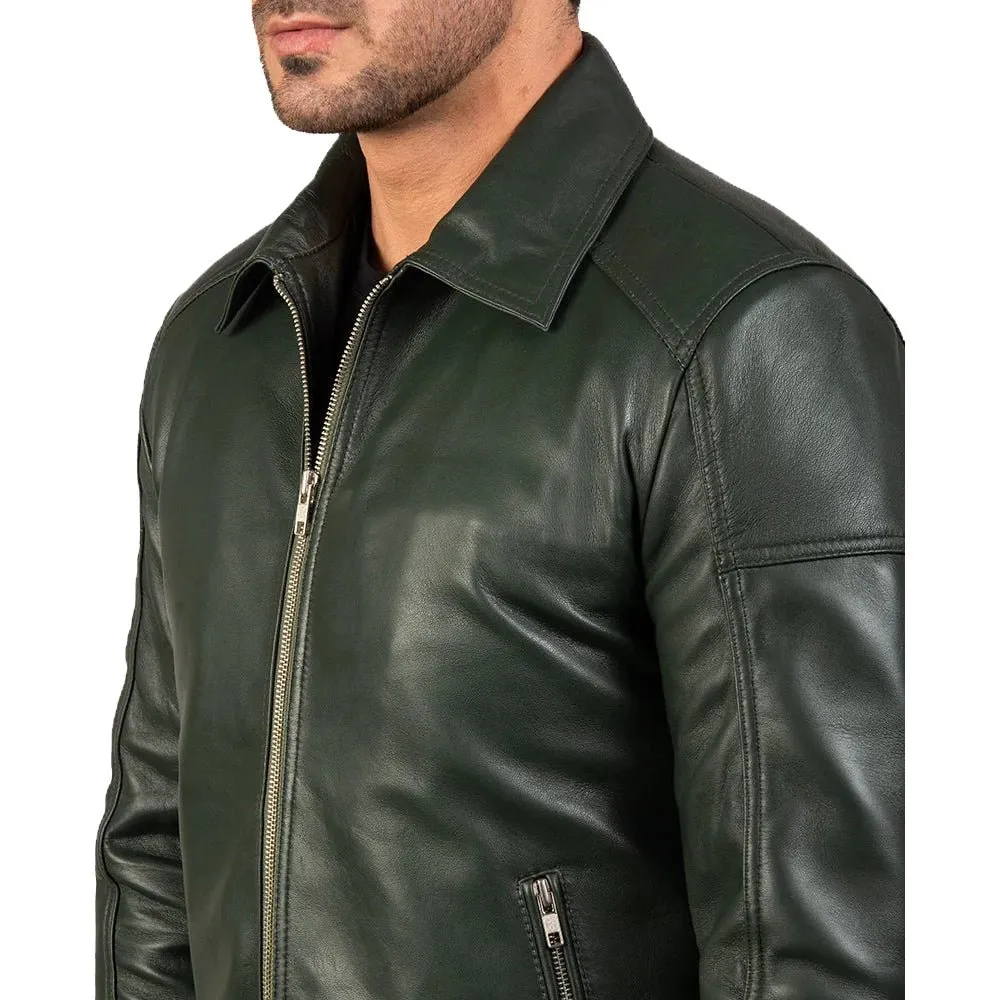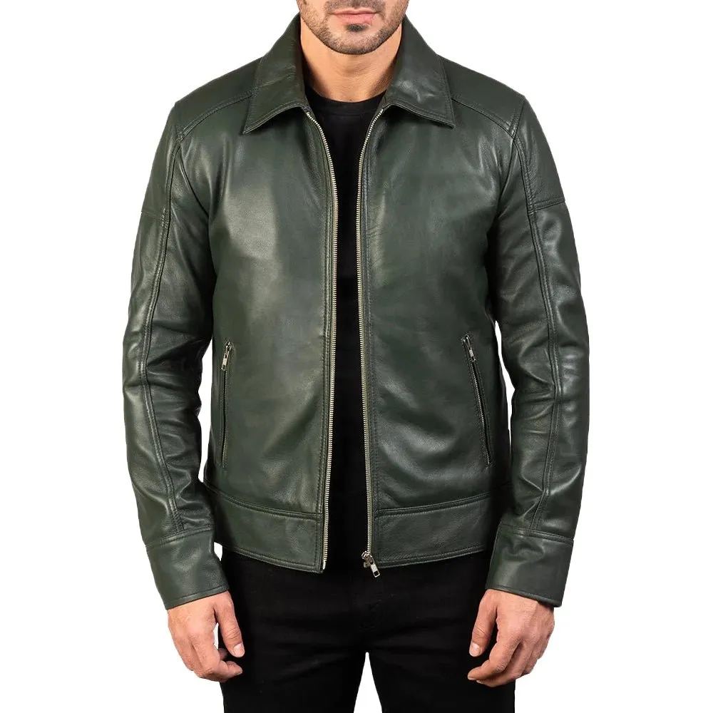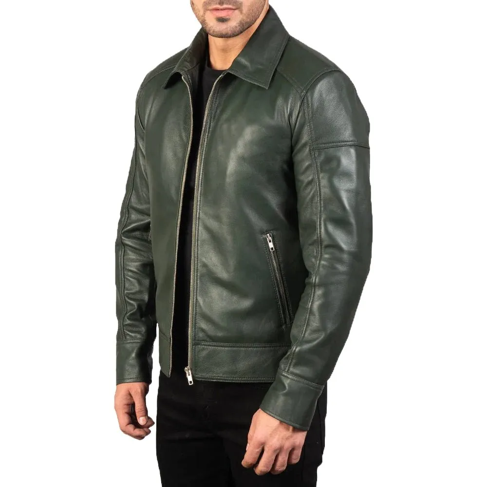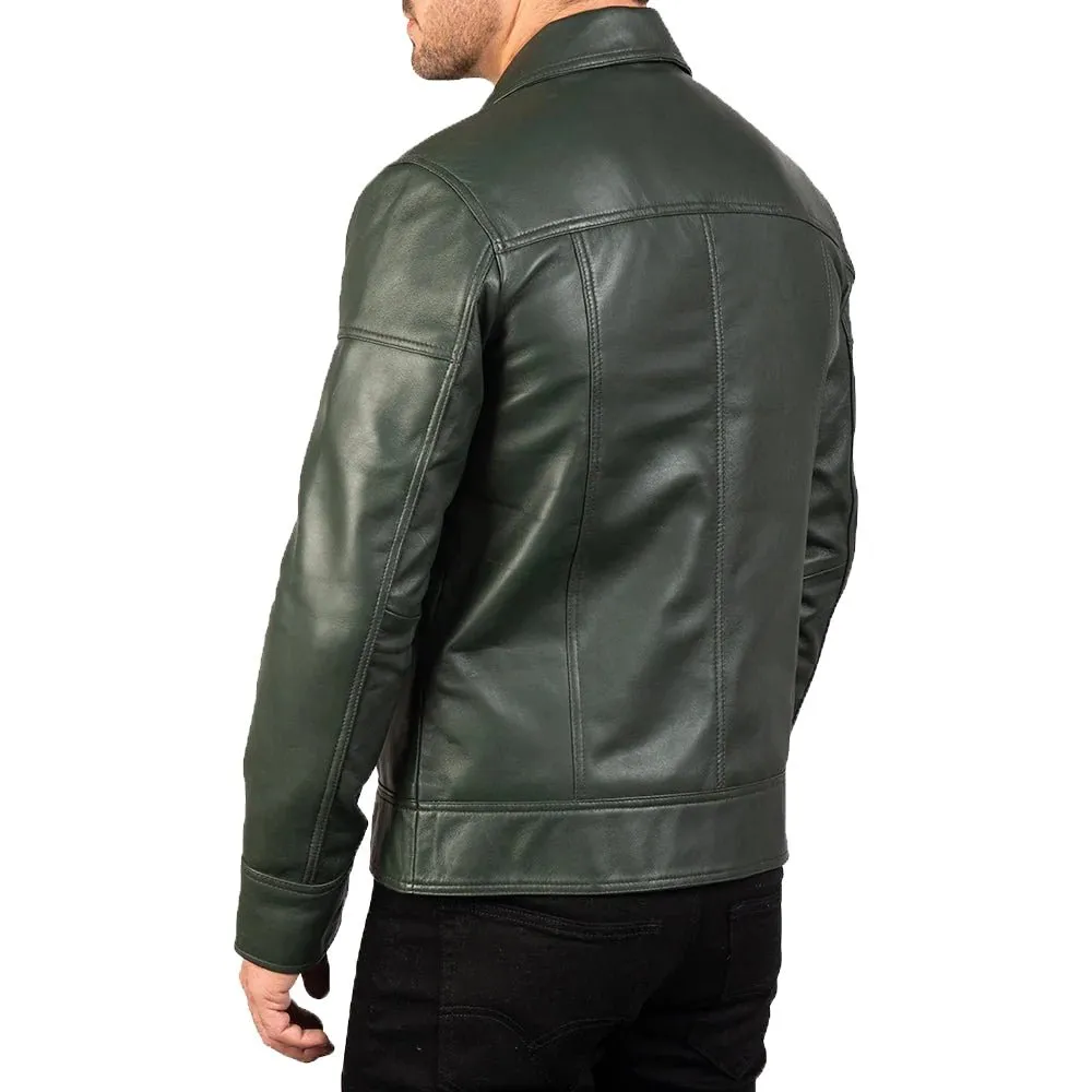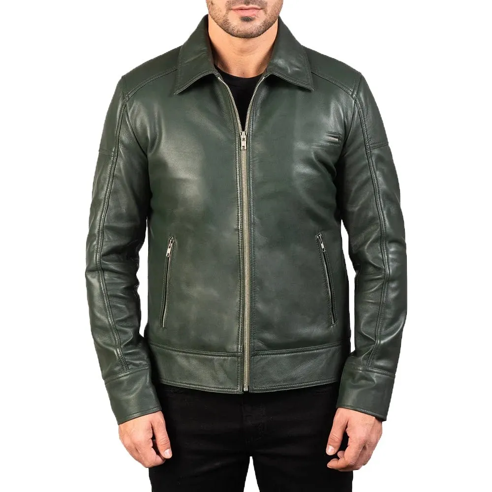 This men’s green leather biker jacket is a bold and stylish choice for those who want to stand out. Crafted from genuine leather with a soft viscose lining, it offers both comfort and durability. The shirt-style collar adds a classic touch, while the vibrant green color gives it a fresh, modern edge.