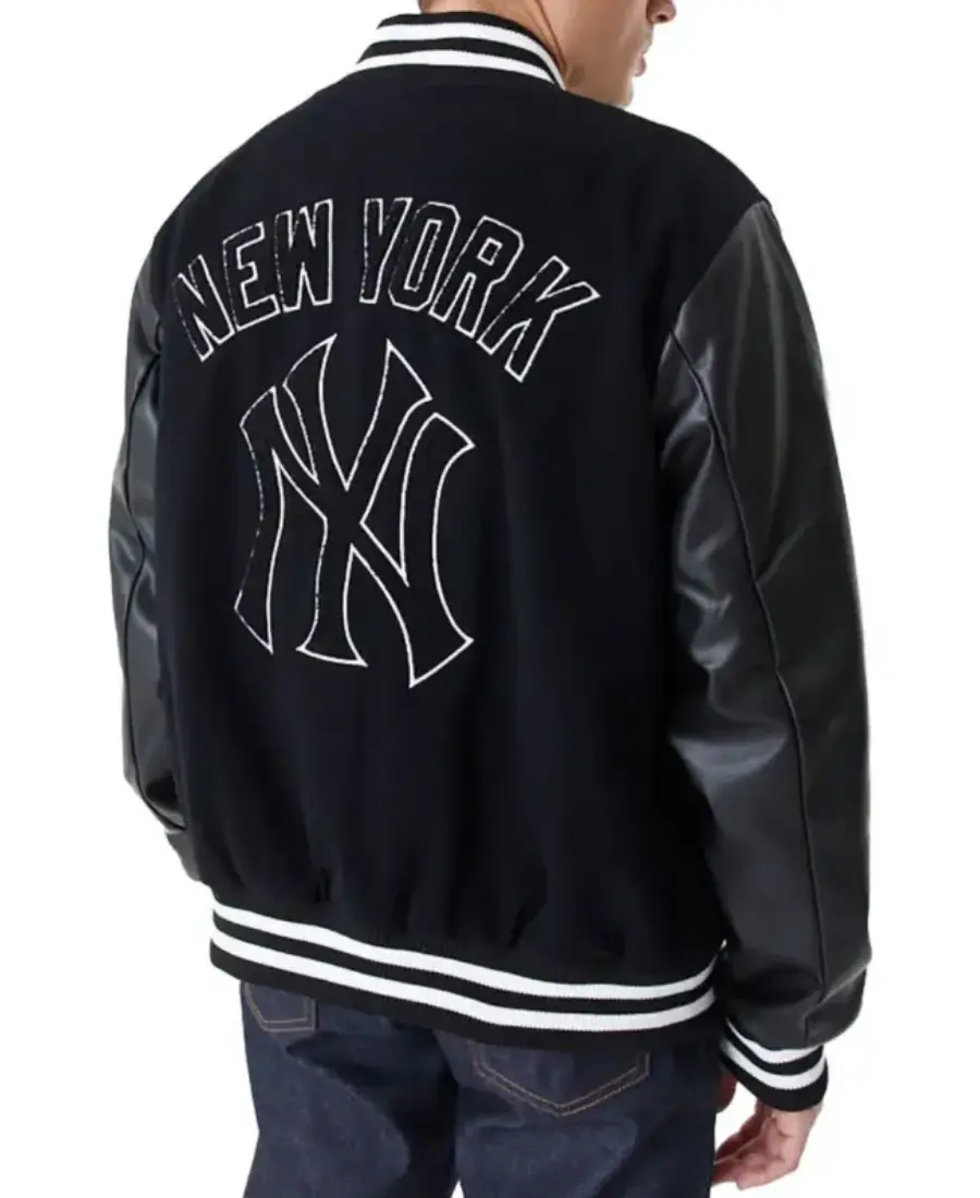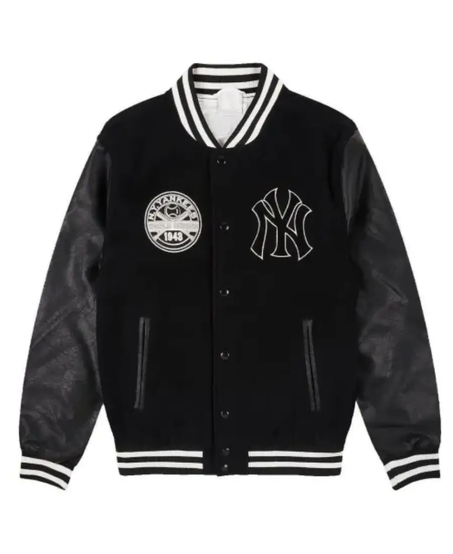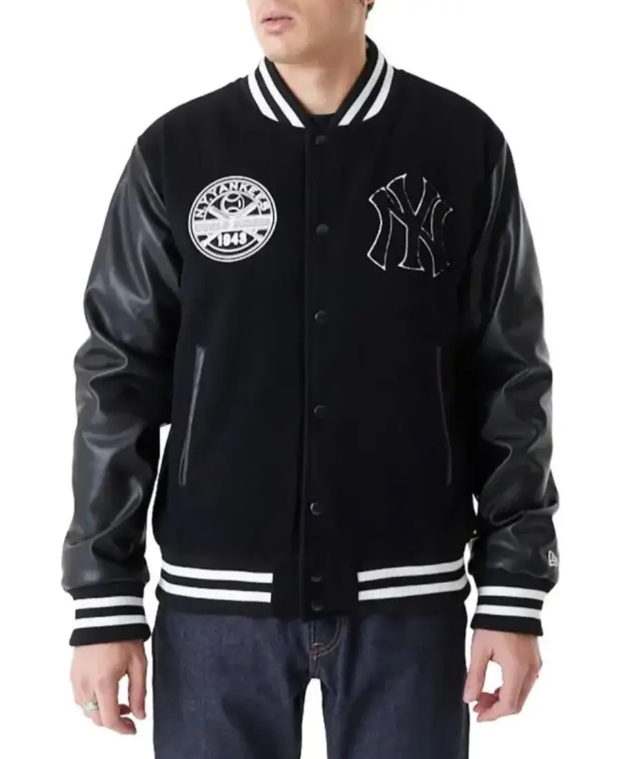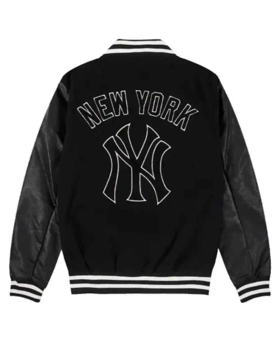 The Men’s Black New York Large Logo Varsity Jacket delivers a bold, street-ready look with classic varsity appeal. Made with a wool body and leather sleeves, it offers durability and warmth, while the soft viscose lining keeps it comfortable for everyday wear.
