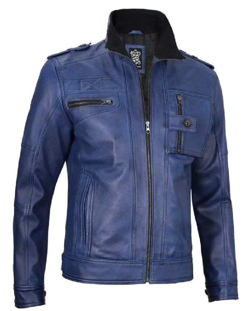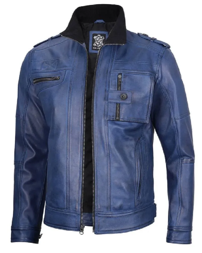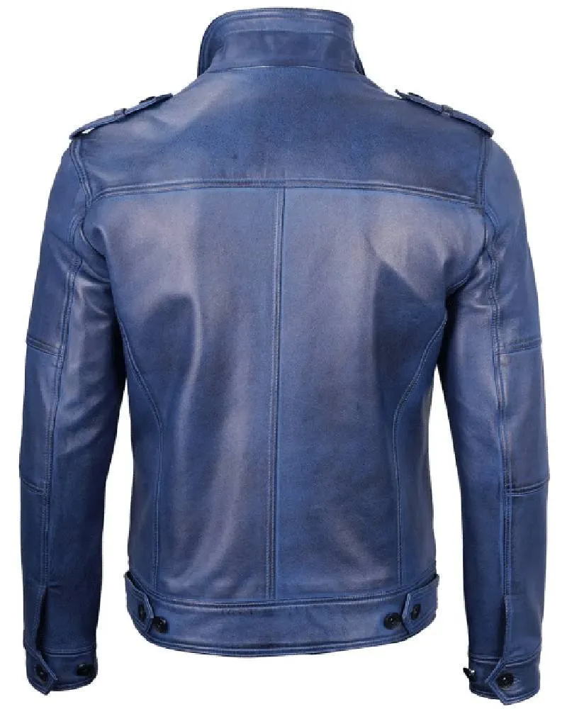 Mens Blue Leather Biker Jacket