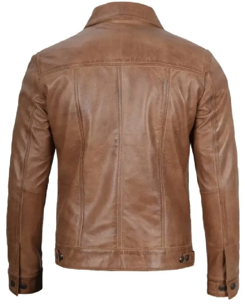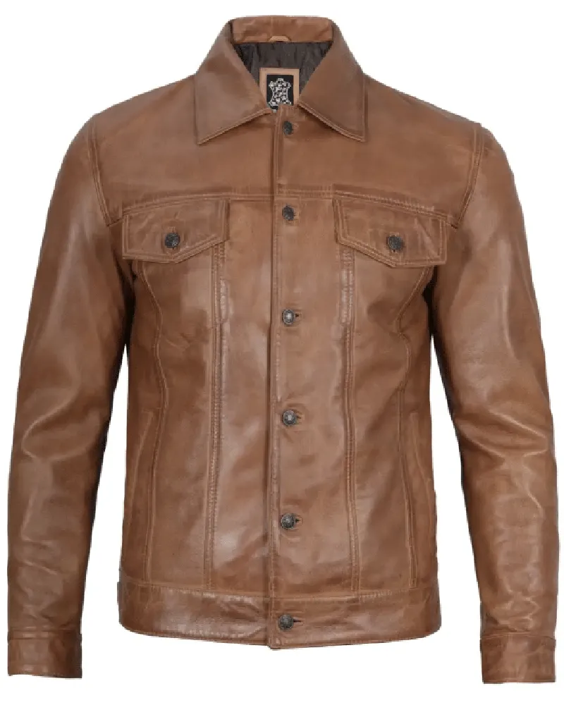 Mens Camel Brown Trucker Leather Jacket