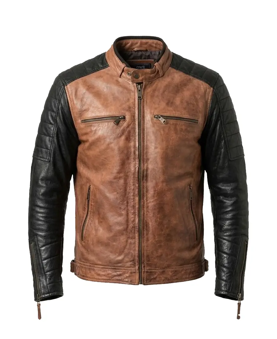 The Men’s Helston Motorcycle Leather Jacket is crafted from genuine leather in a distressed brown and black finish that gives it a rugged and bold look inspired by classic motorcycle style. It features an erect collar that adds a sharp edge to the neckline along with a front zip closure for secure and easy fastening. Full length sleeves with open hem cuffs provide comfort and natural movement while keeping the jacket’s strong silhouette. Inside, a soft viscose lining ensures all day comfort. Designed with two side pockets, two chest pockets, and one inner pocket, this jacket offers practical space for essentials while presenting a striking, road ready style that stands out in casual and riding outfits alike.