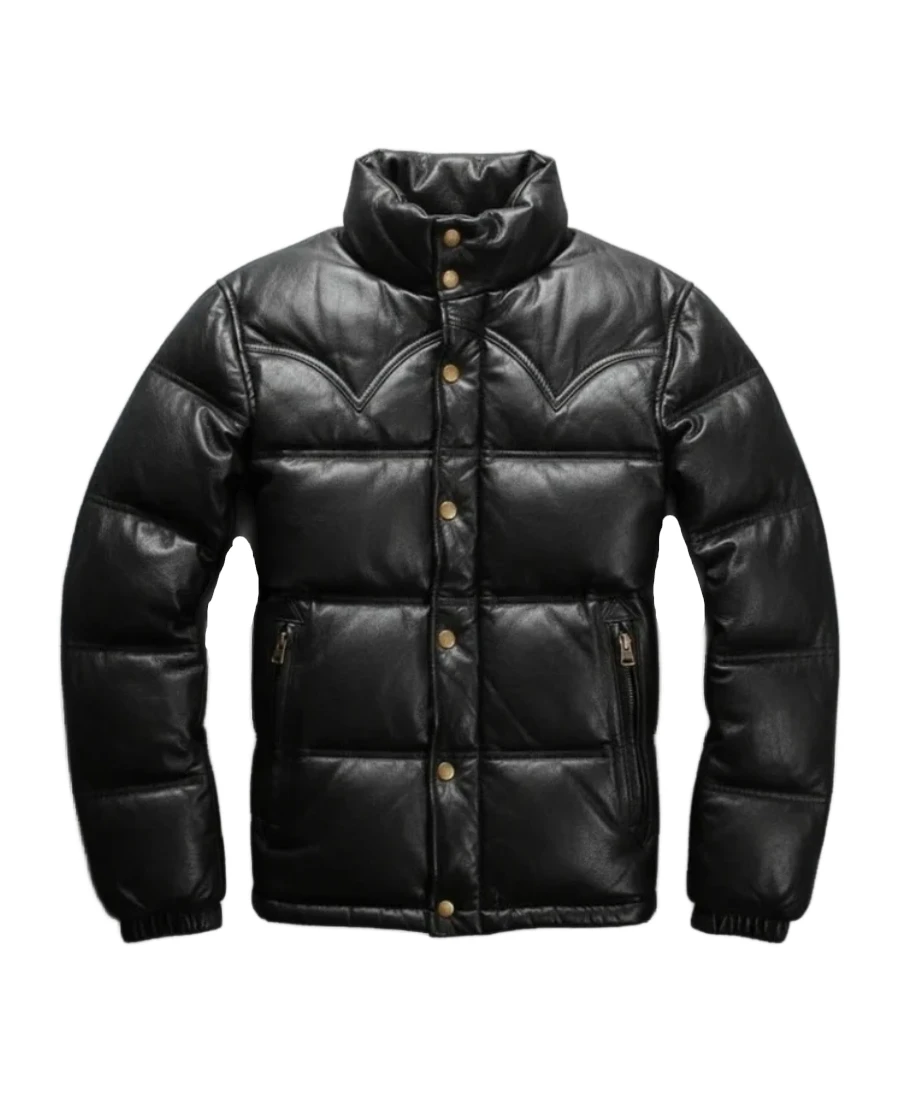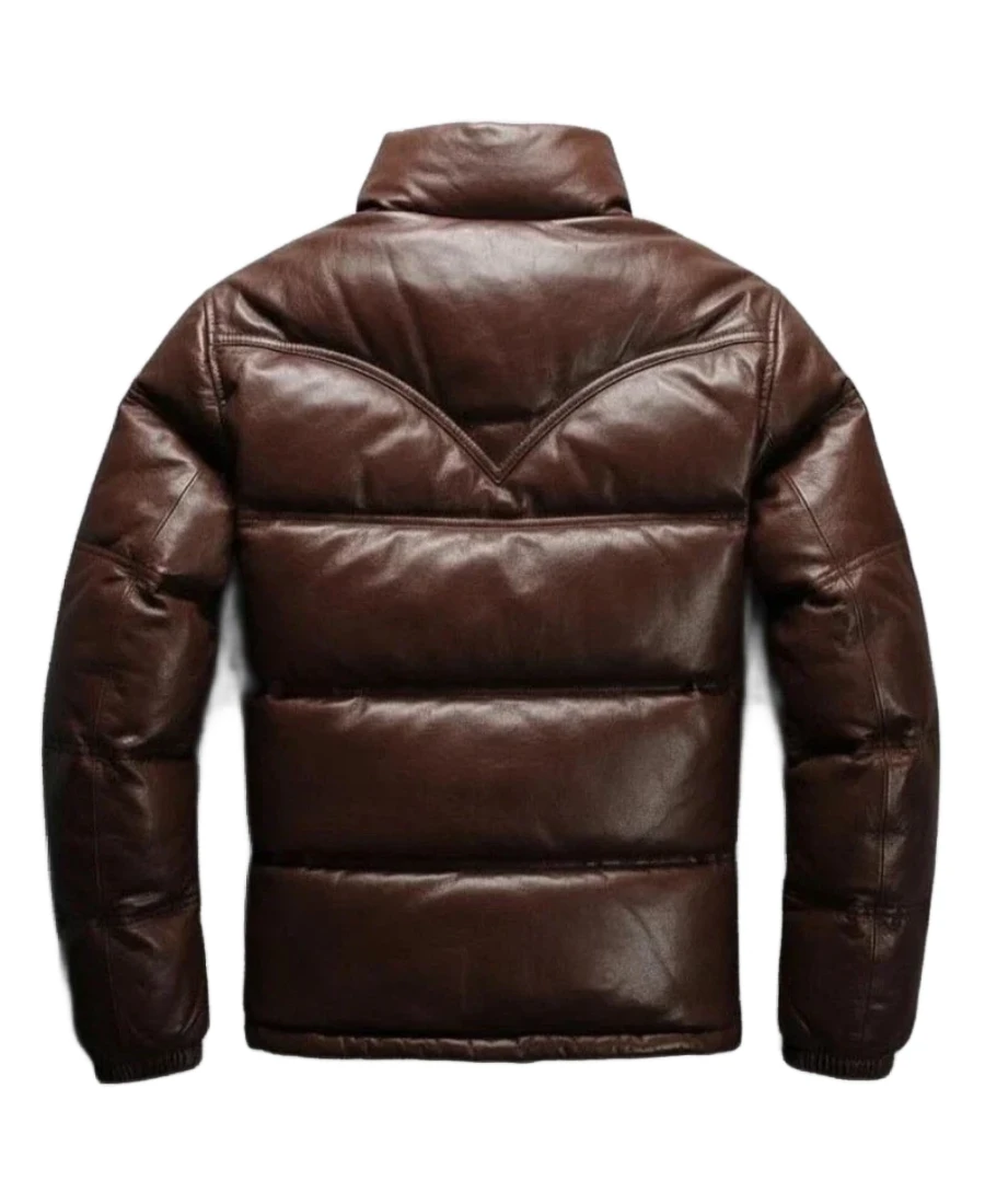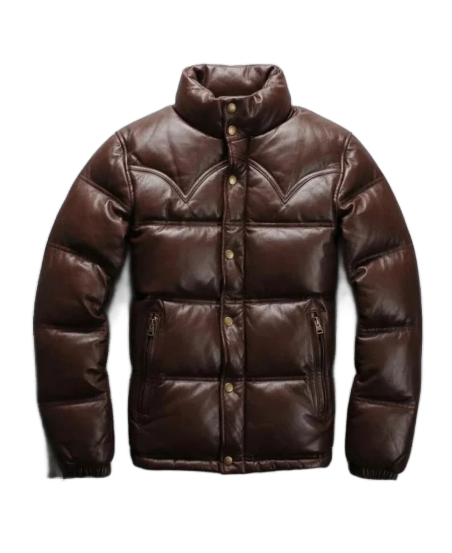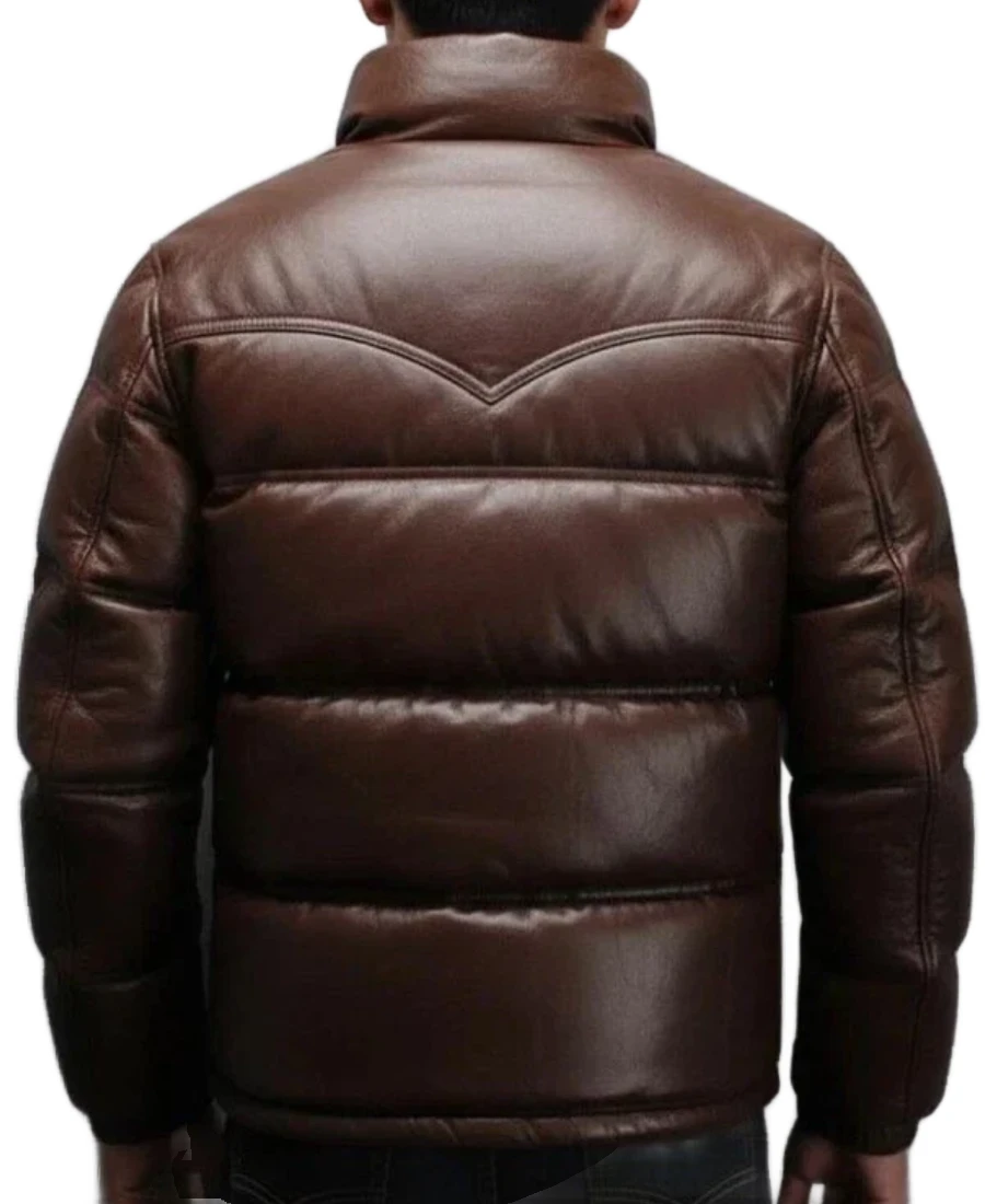 The Men’s Leather Puffer Jacket is made for those who want extra warmth without giving up a strong everyday look this piece comes with a real leather outer that gives a solid feel and helps protect against cold weather while the inner viscose lining keeps it light enough for regular use the stand up collar adds extra coverage around the neck which makes it useful during windy days and also gives the jacket a clean appearance the elastic cuffs help keep the sleeves in place and stop cold air from getting inside which makes it more practical for winter wear the front includes both snap button and zipped closure which gives you better control and makes it easy to wear in different ways full length sleeves provide full coverage and help complete the overall design the jacket includes two side pockets for daily use along with one inner pocket to keep your essentials safe the black and brown color options give you the choice to go for a darker look or a more natural tone depending on your style this jacket belongs to the Puffer Jackets category which is known for its warm build and daily use making it a reliable option for anyone who wants a jacket that can handle colder days while still keeping a clean and simple look.