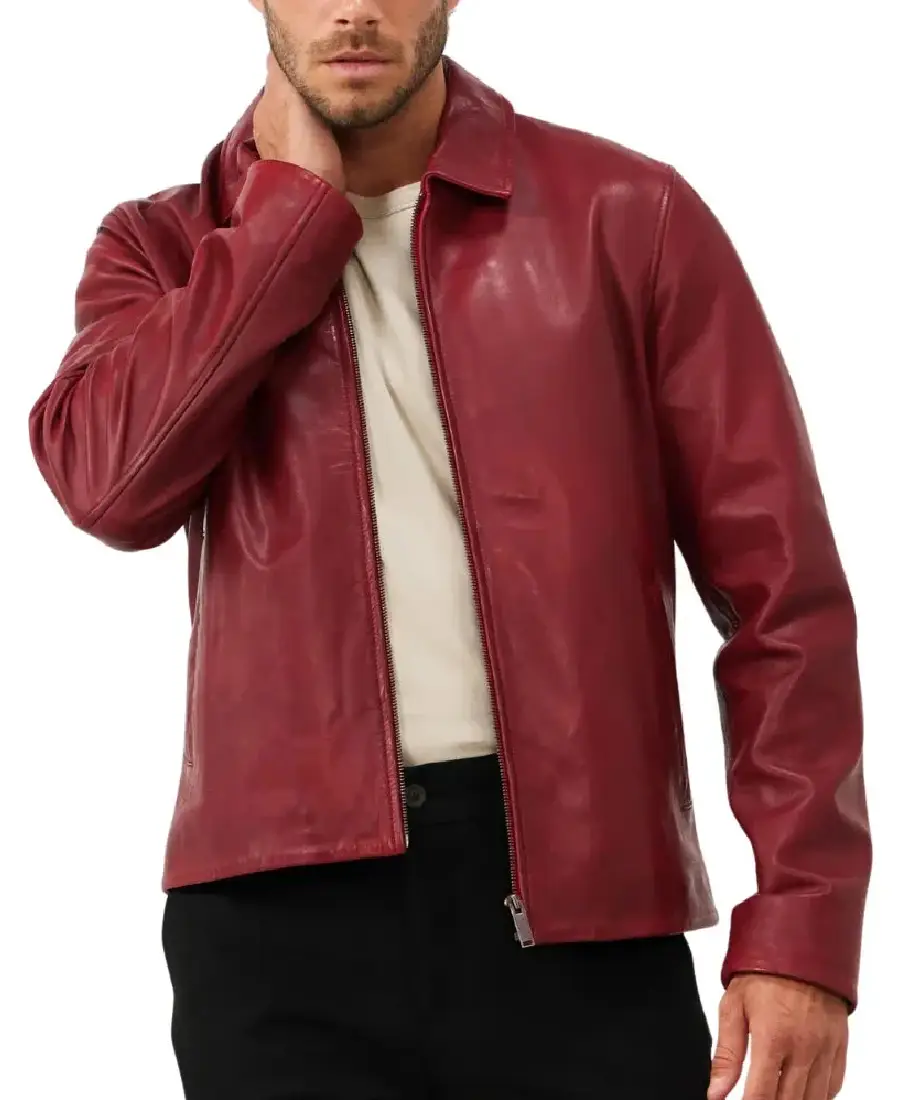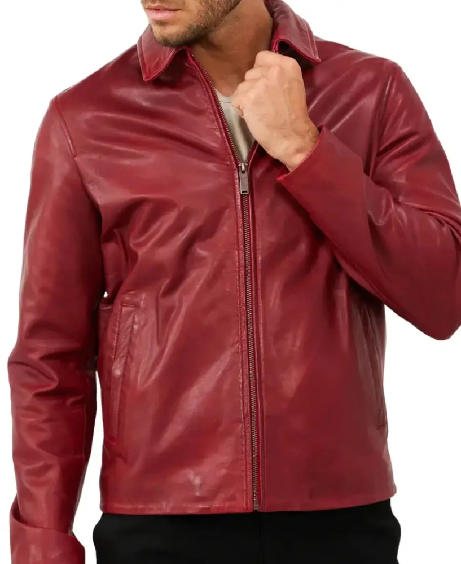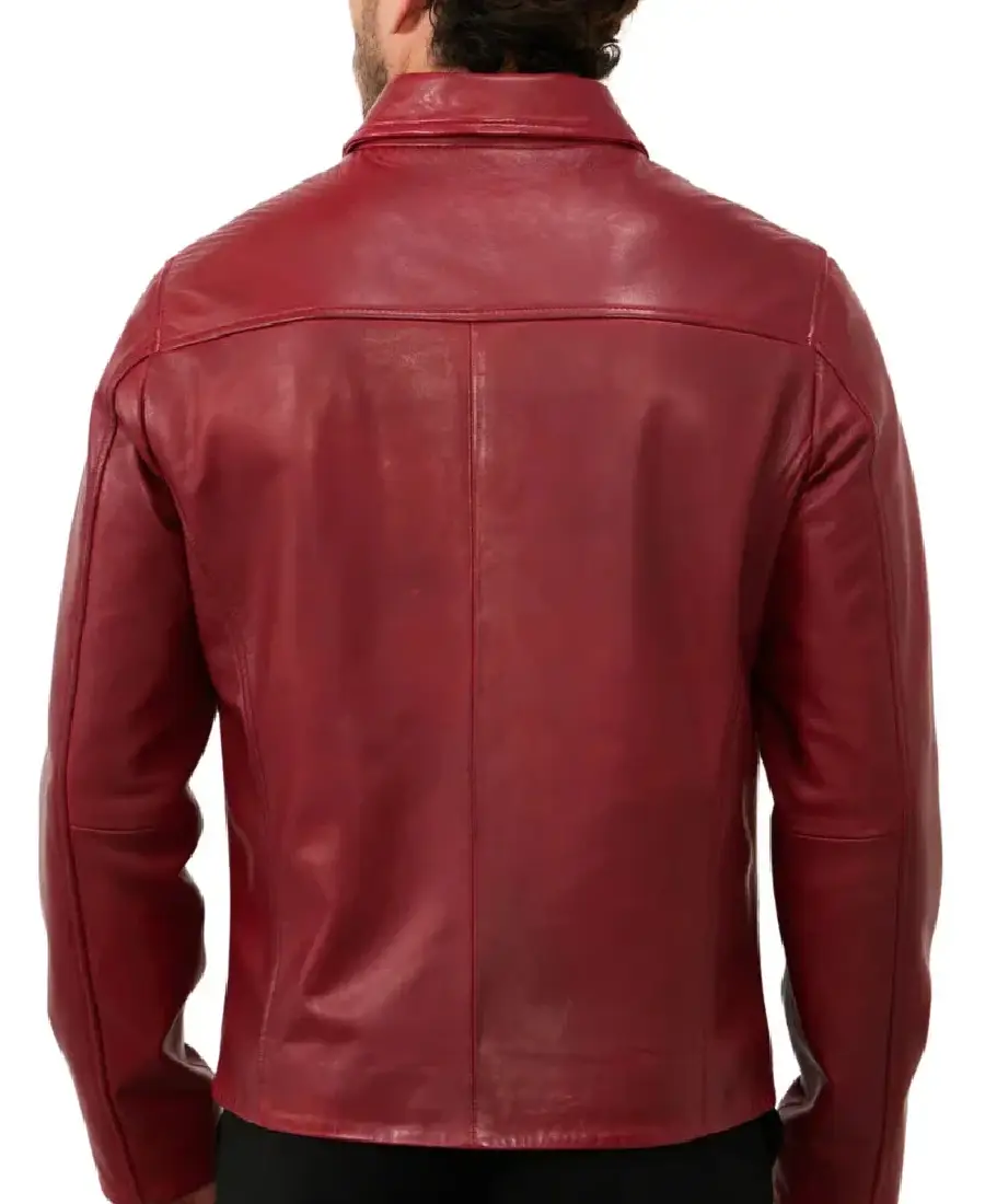 Men’s Red Shirt Collar Leather Biker Jacket