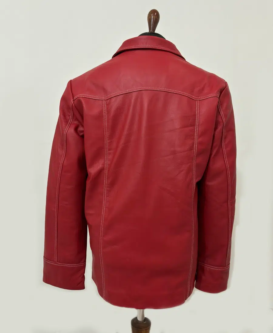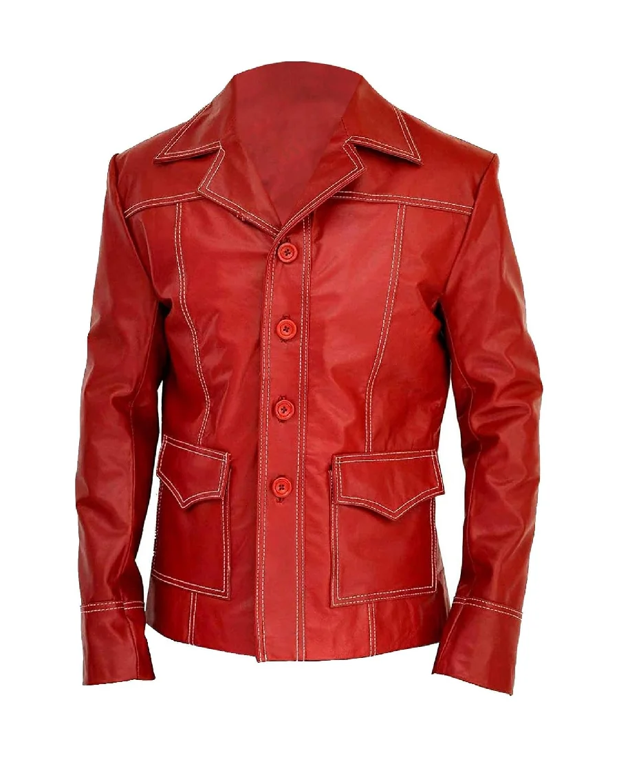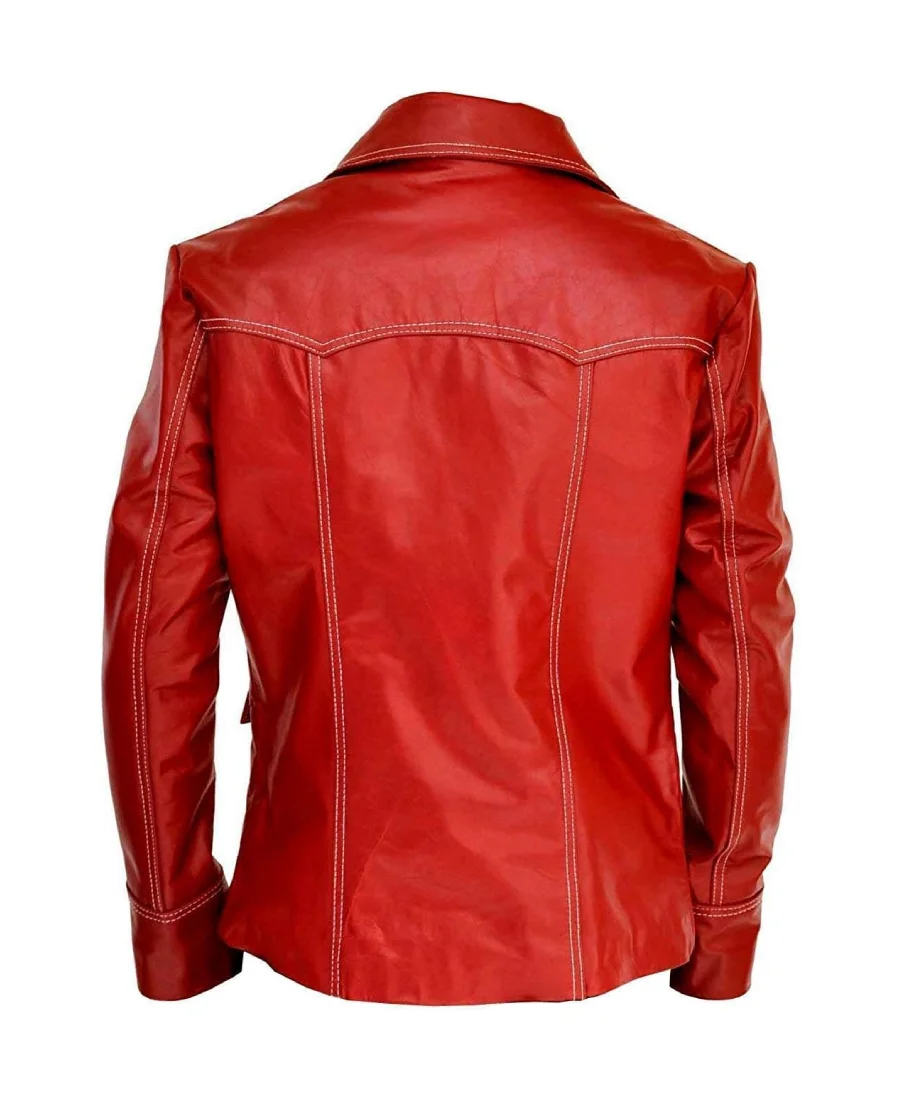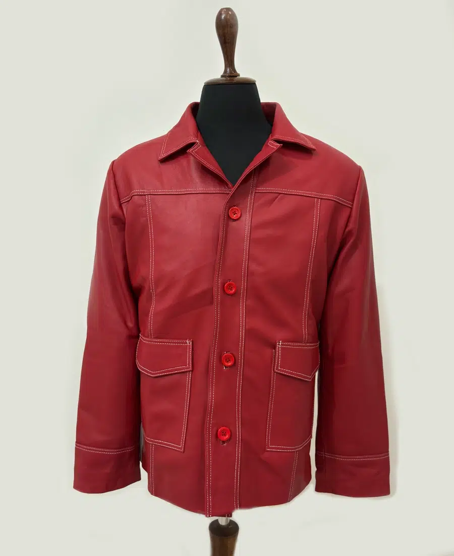 Handcrafted from 100% genuine lambskin leather, the jacket offers an exceptionally soft, supple texture while maintaining durability and structure. The bold blood-red color instantly commands attention, while the contrasting white stitching and classic biker silhouette highlight its vintage-inspired design. Featuring a front button closure, notch lapel collar, and multiple front pockets, every detail reflects the rugged charisma of Tyler Durden himself.