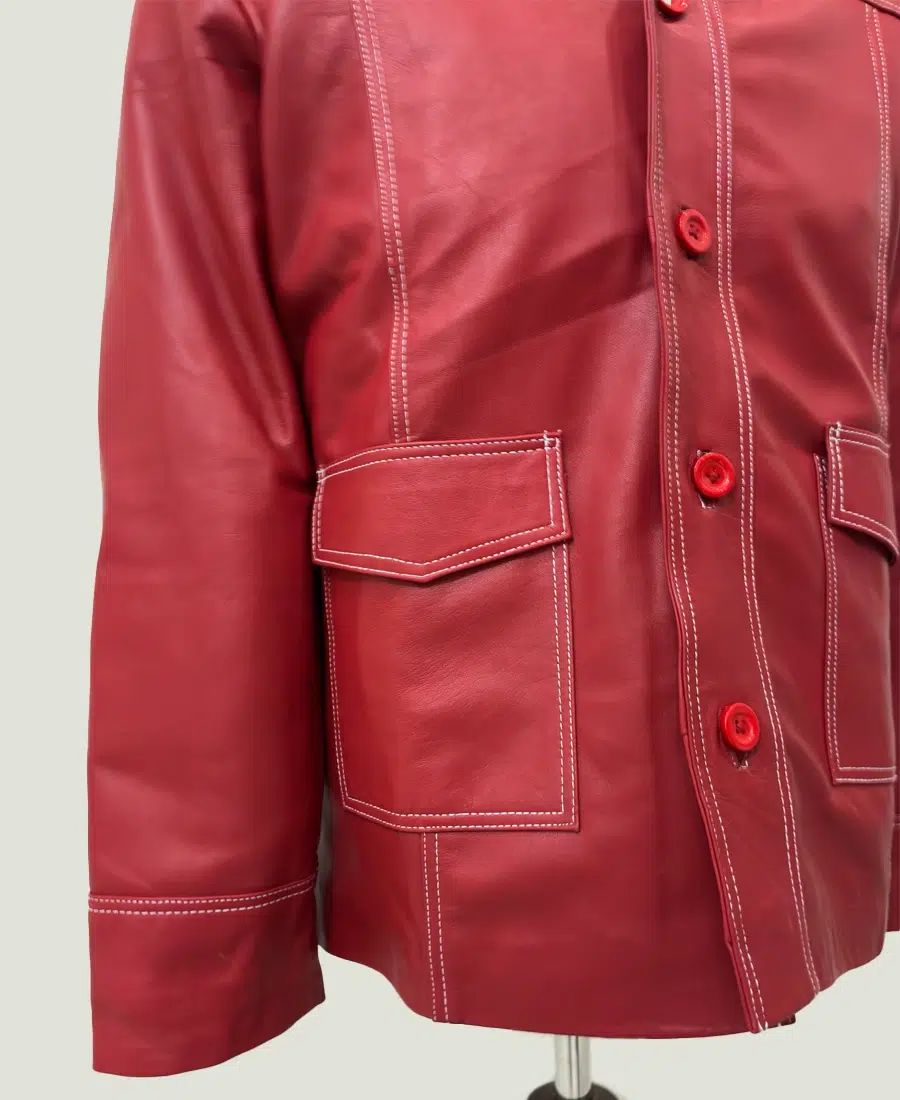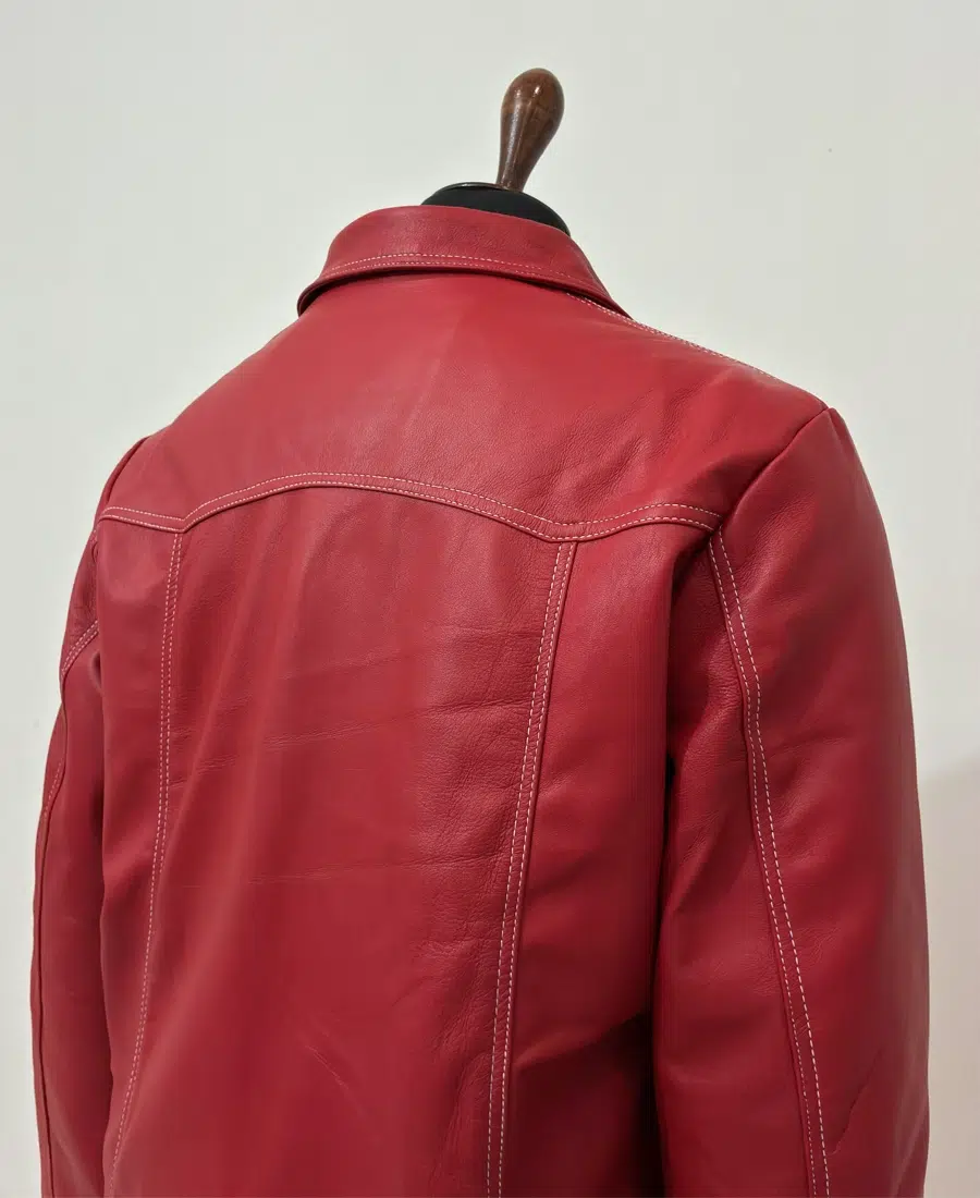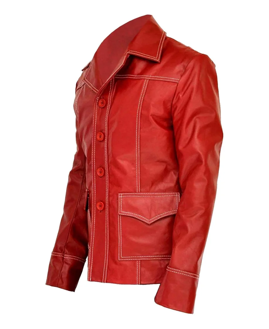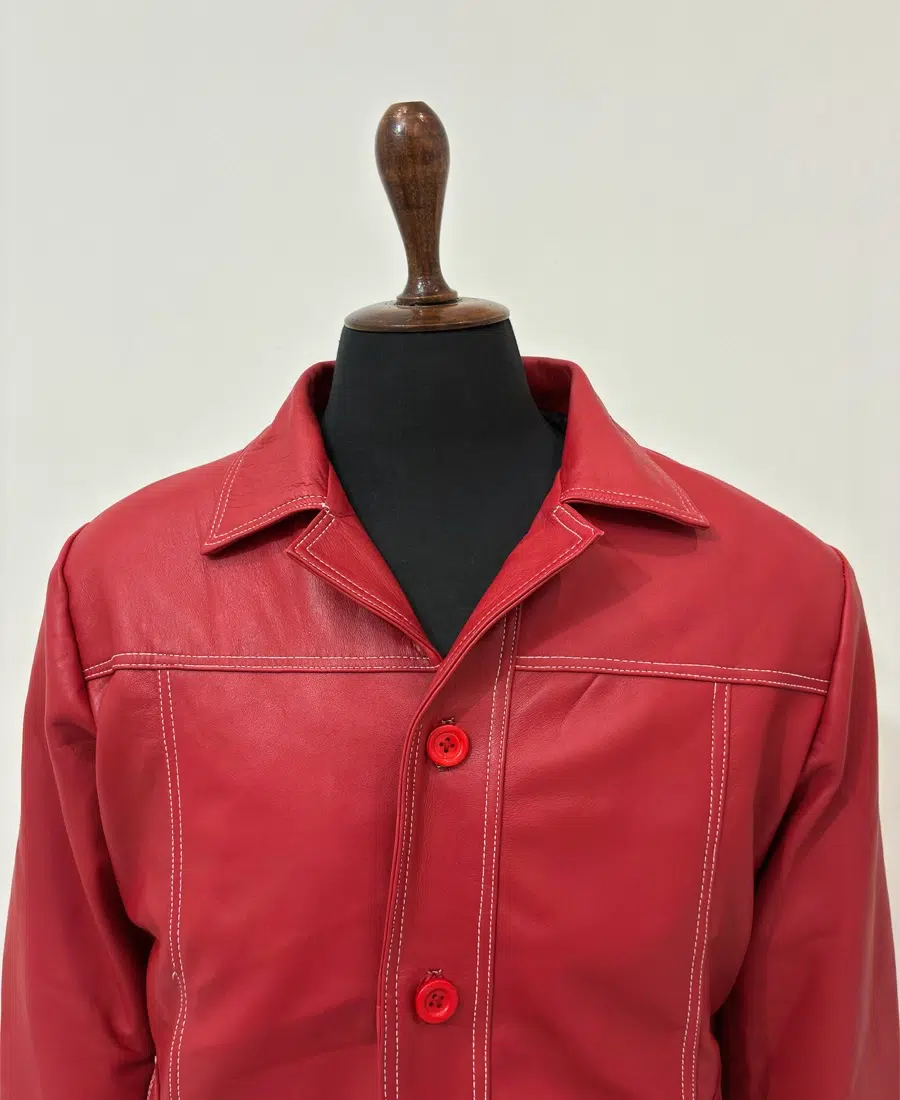 Handcrafted from 100% genuine lambskin leather, the jacket offers an exceptionally soft, supple texture while maintaining durability and structure. The bold blood-red color instantly commands attention, while the contrasting white stitching and classic biker silhouette highlight its vintage-inspired design. Featuring a front button closure, notch lapel collar, and multiple front pockets, every detail reflects the rugged charisma of Tyler Durden himself.