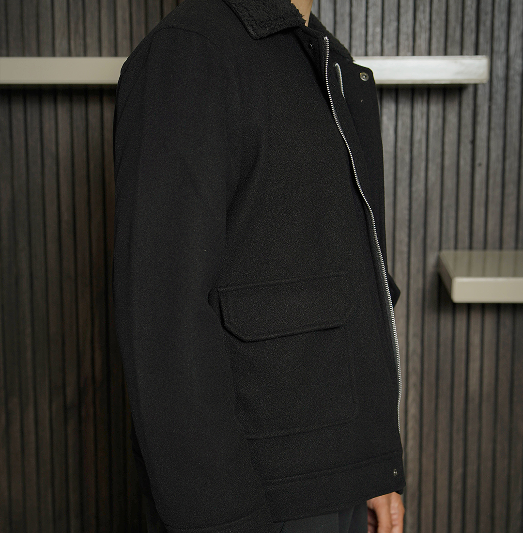Beyond its stunning look, this jacket is built with high-quality materials to ensure long-lasting durability. The premium wool blend felt offers exceptional insulation, making it a reliable choice for the coldest days. We have equipped this jacket with a dual closure system featuring both a smooth zipper and secure snap buttons to keep the wind out effectively. It also includes two spacious front flap pockets to keep your essentials safe and snap button cuffs for a customized fit. Every detail is carefully stitched to make this black jacket a dependable and fashionable staple in your collection for years to come.