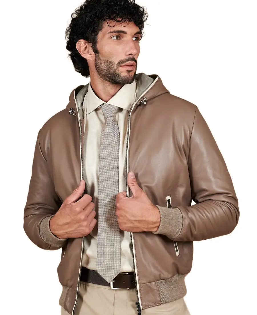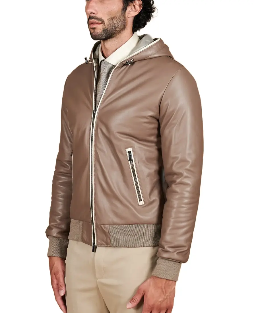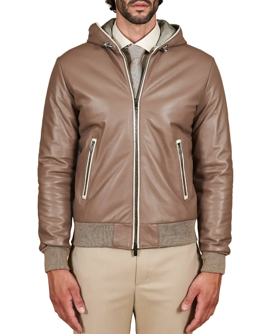 Shop The Men’s Taupe Hooded Bomber Leather Jacket
