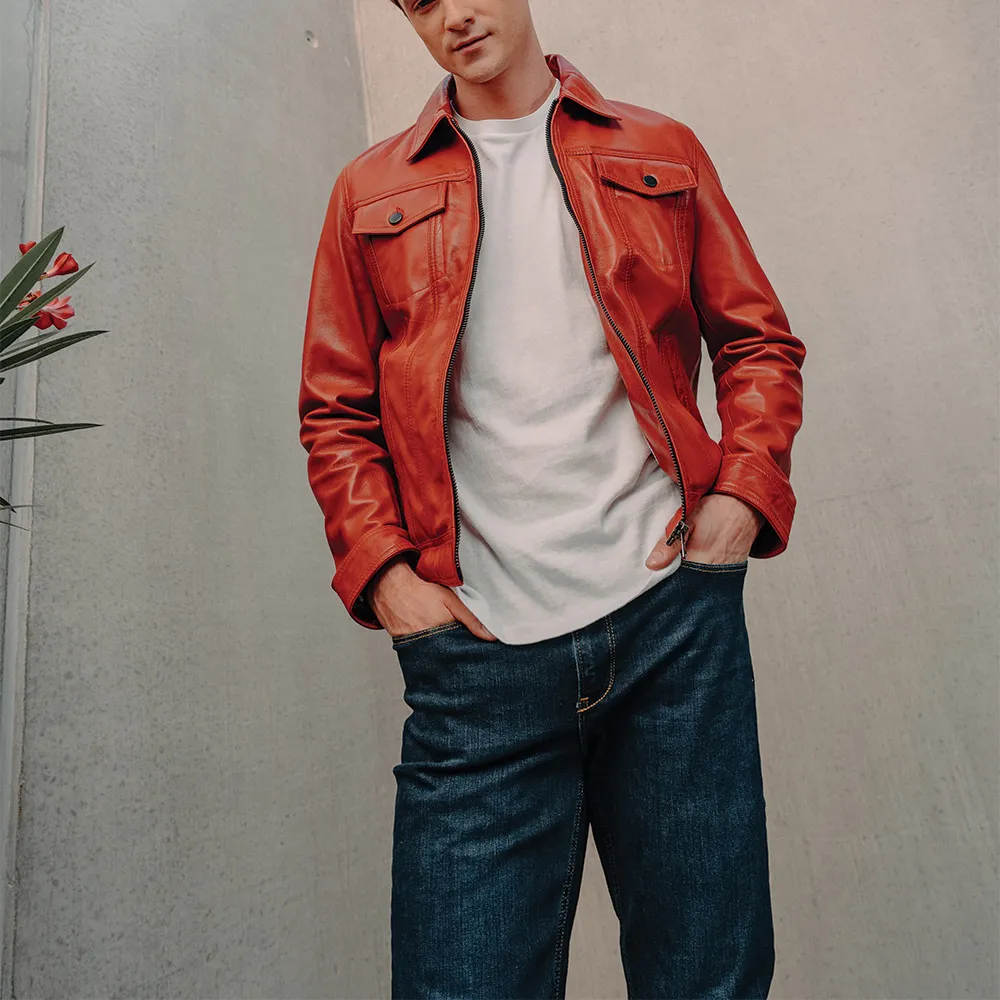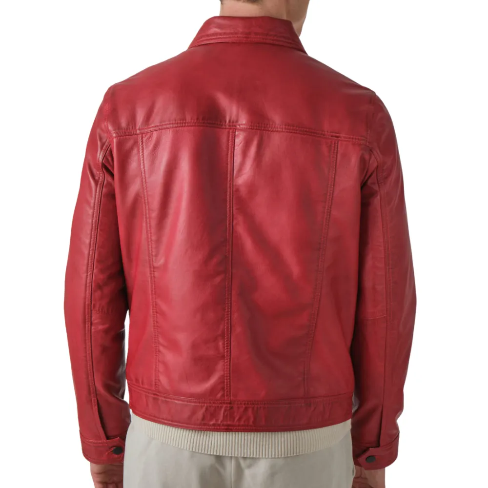 Mens Vintage Red Trucker Leather Jacket