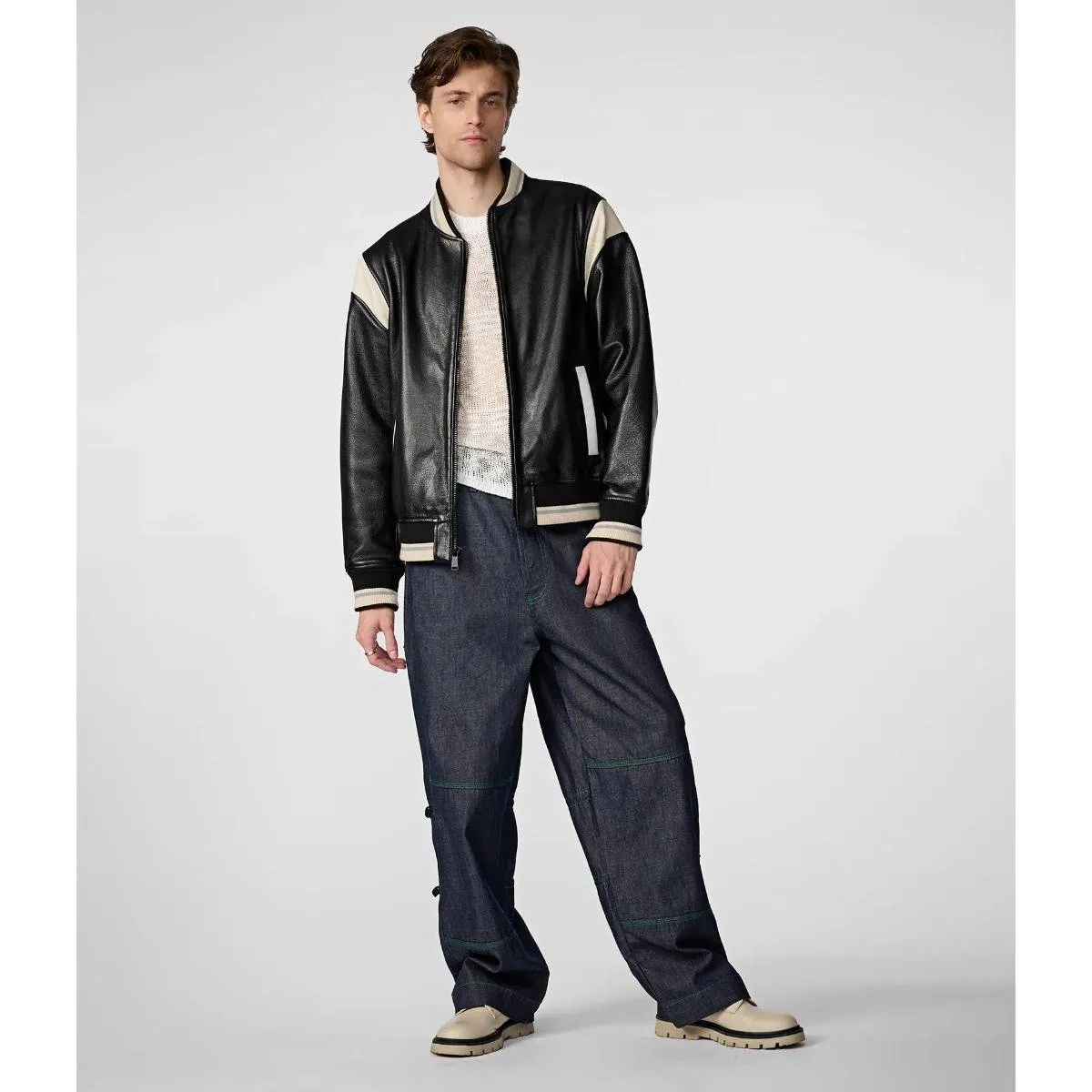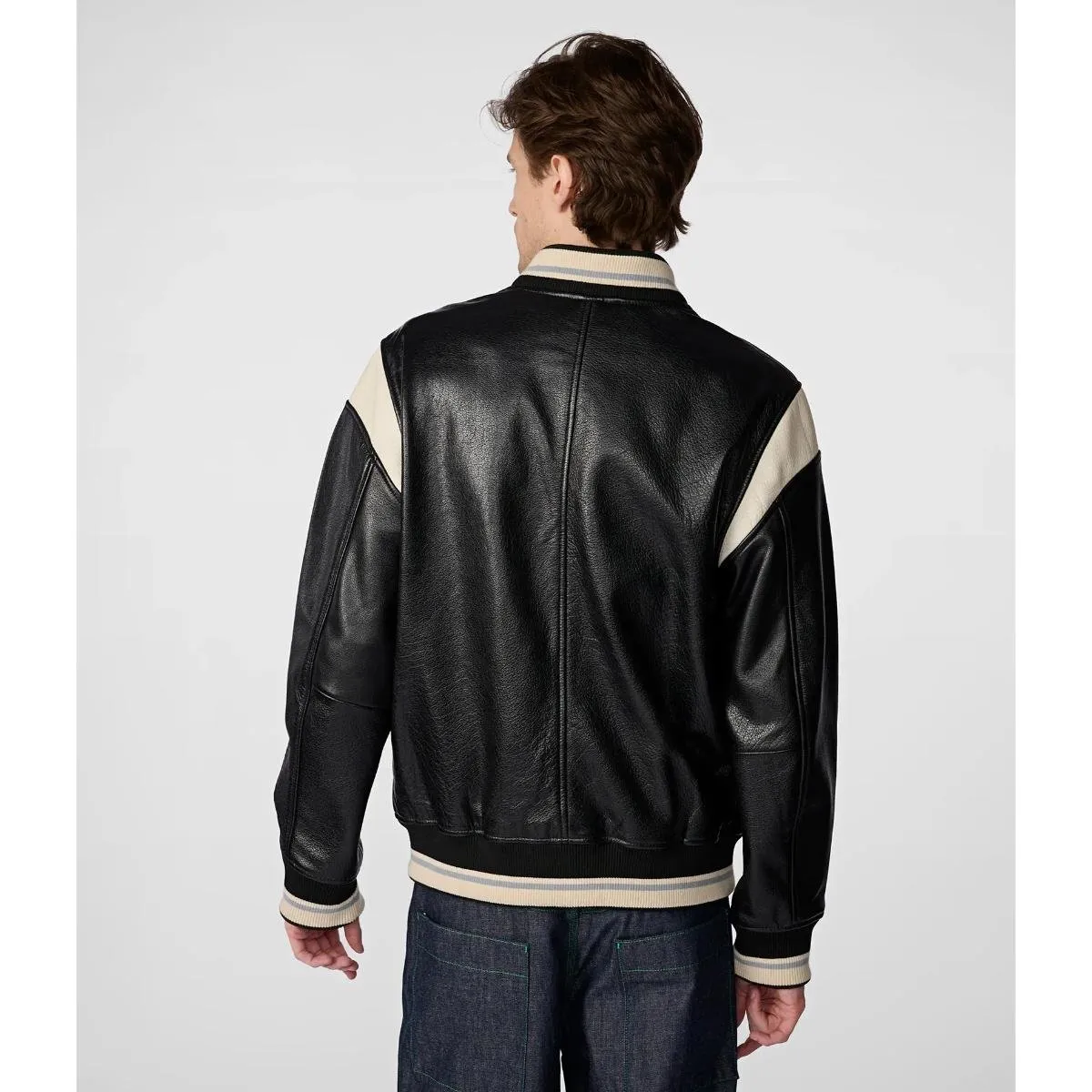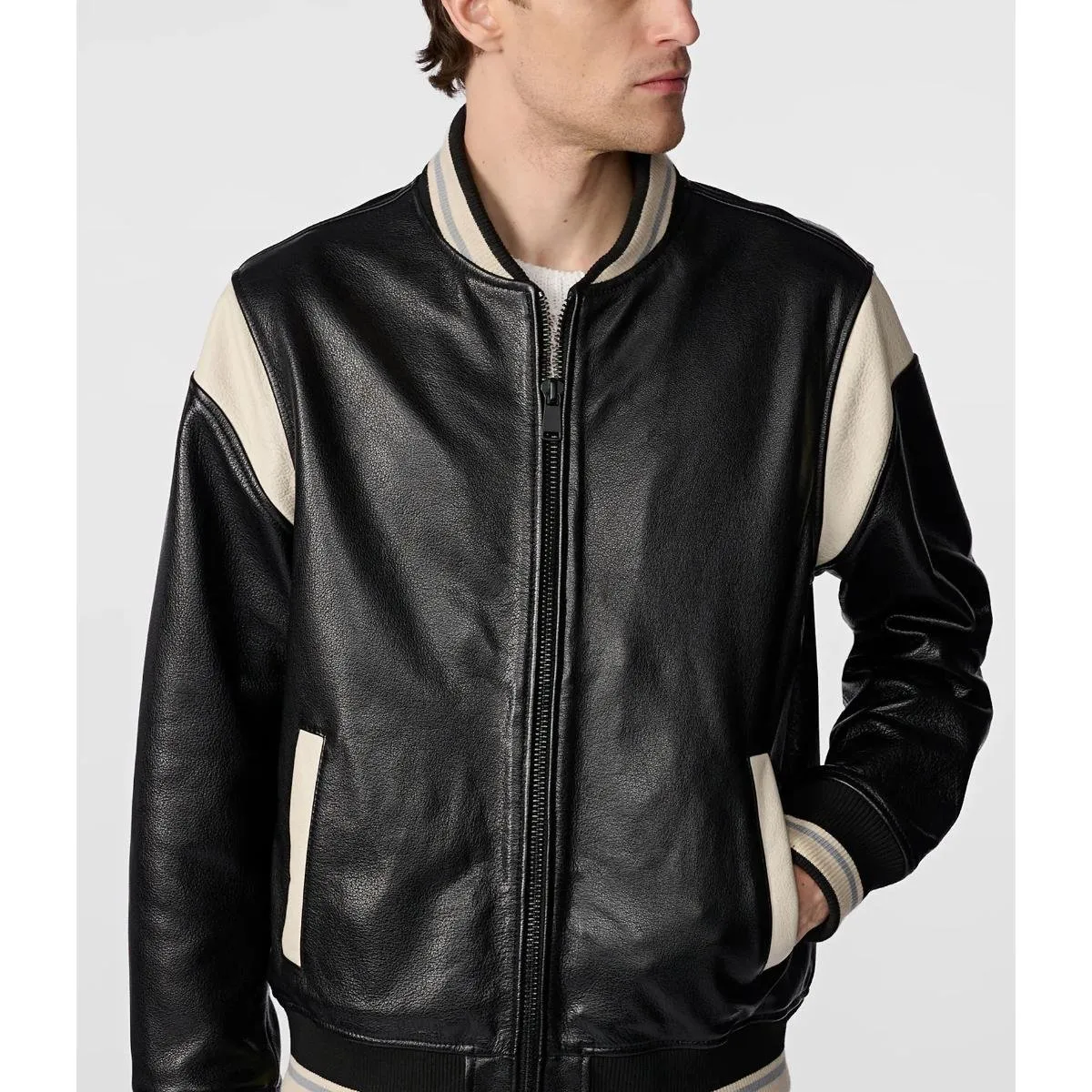 Shop The Men’s White Stripped Leather Varsity Jacket