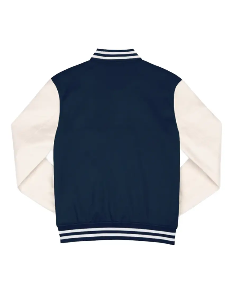 The Michigan Navy and White Varsity Jacket is made with a wool body and leather sleeves in a navy and white color combination that gives it a classic varsity look. It features a ribbed collar and ribbed cuffs that provide a snug fit at the neck and wrists, while the front snap button closure allows easy and secure fastening. Full length sleeves complete the traditional varsity shape, and the inner viscose lining adds comfort for long hours of wear. Two side pockets offer practical space for small essentials while maintaining the clean and sporty aesthetic, making this jacket a standout choice for school spirit, casual wear, or vintage inspired outfits.