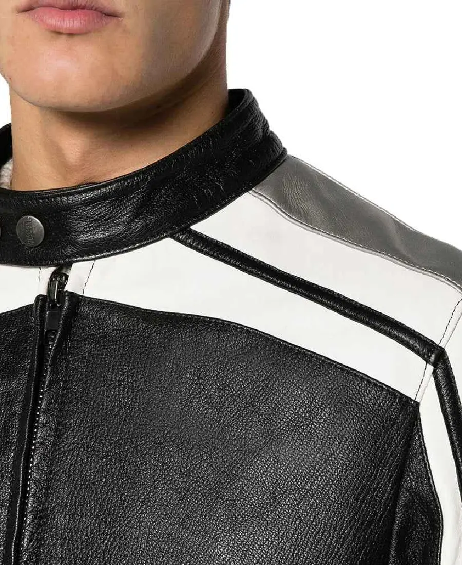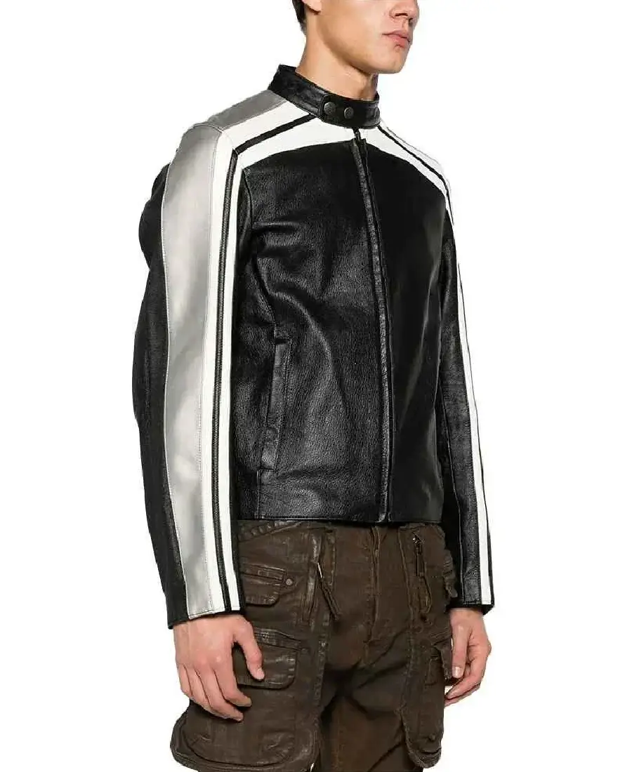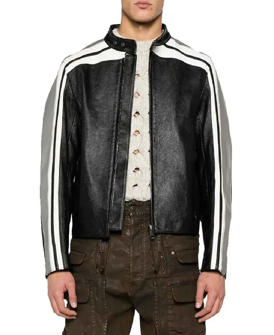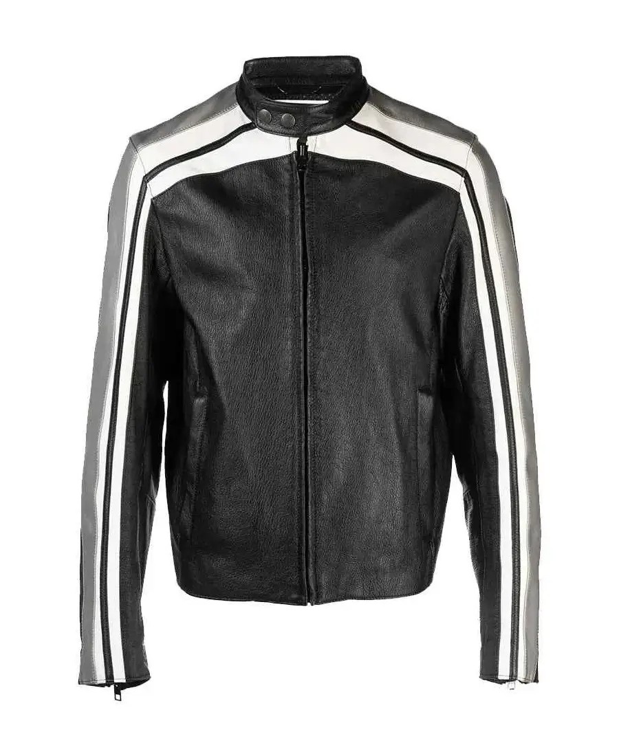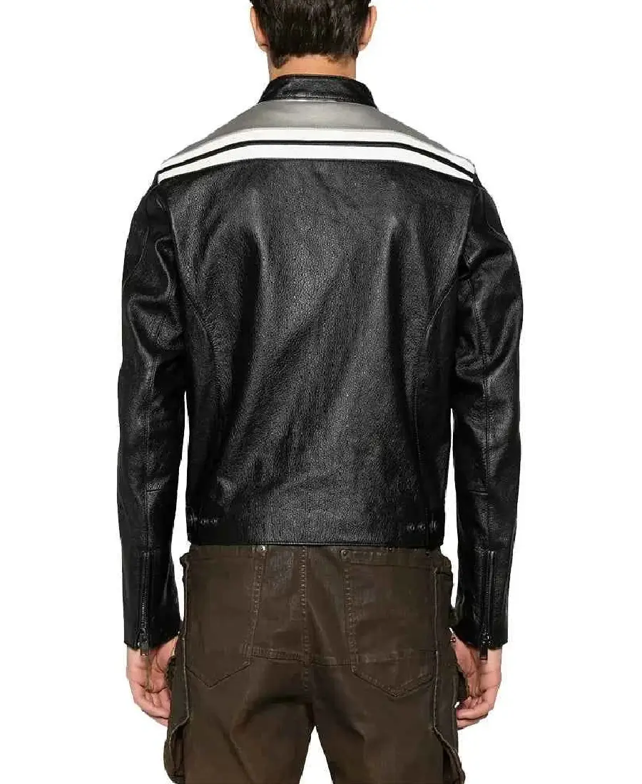 Moschino Strips Detailing Black Leather Biker Jacket