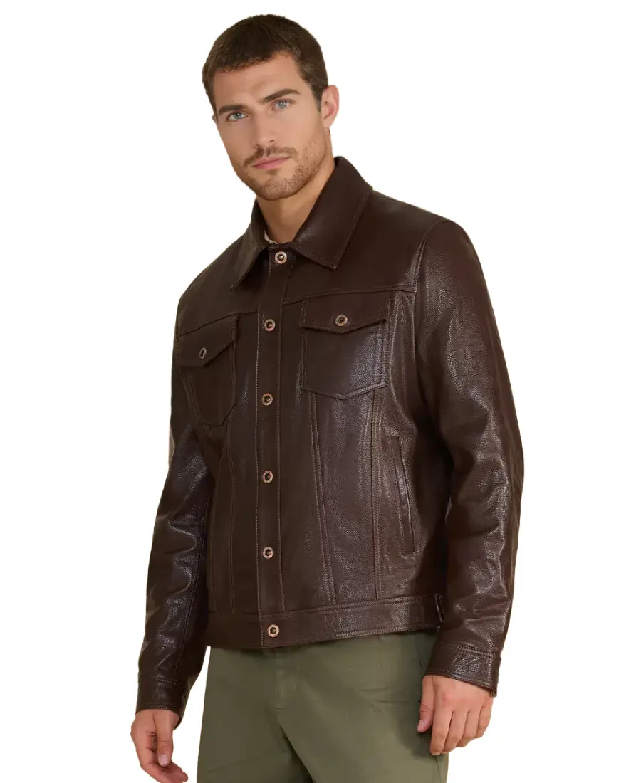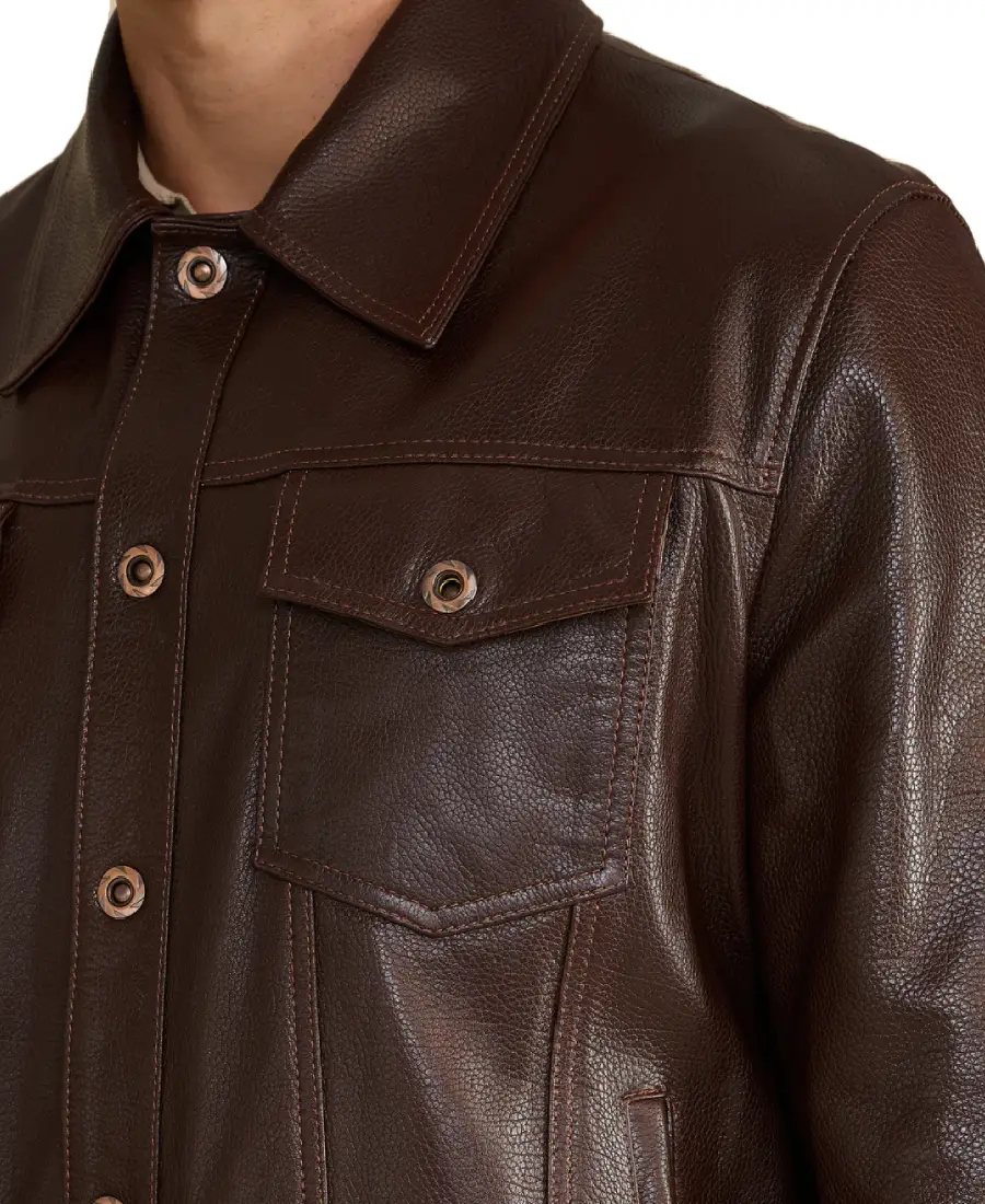 The Oliver Dark Brown Leather Jacket is built for those who want a structured yet approachable outer layer. Made from real leather it has a firm texture that softens naturally with wear while adapting to the shape of the body. The shirt style collar frames the neckline neatly while the snap button closure at the front keeps the fit secure and adds a subtle design detail. Full length sleeves with snap button cuffs allow comfortable movement and a tailored appearance. Inside, the viscose lining creates a gentle layer against the skin making it suitable for long hours of wear. Two side pockets and two chest pockets provide practical storage for everyday essentials while an inner pocket adds extra space for valuables. The dark brown tone brings depth and a grounded look making it ideal for pairing with denim boots or layered casual outfits for a composed and confident style.
