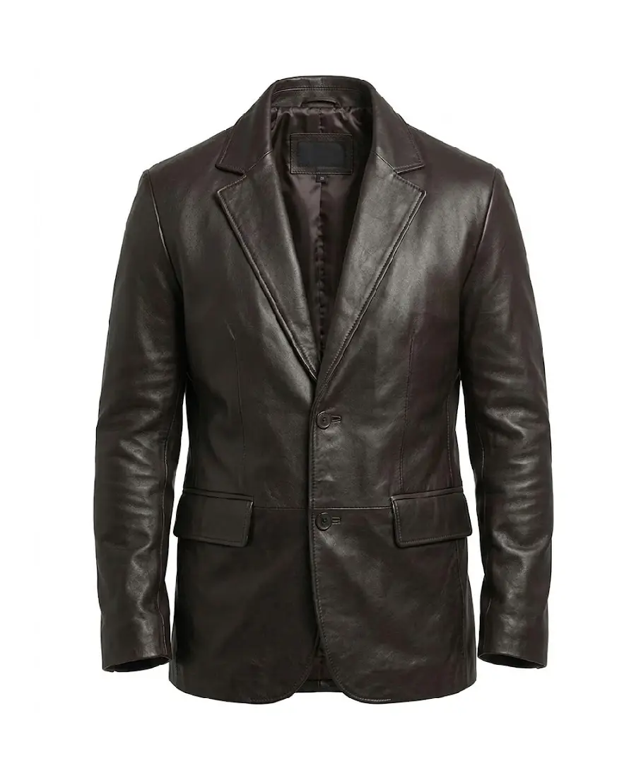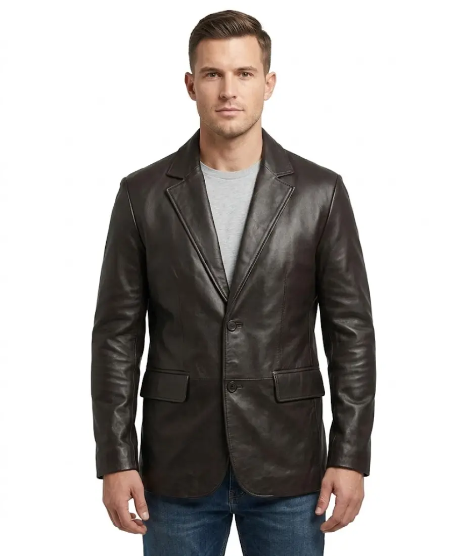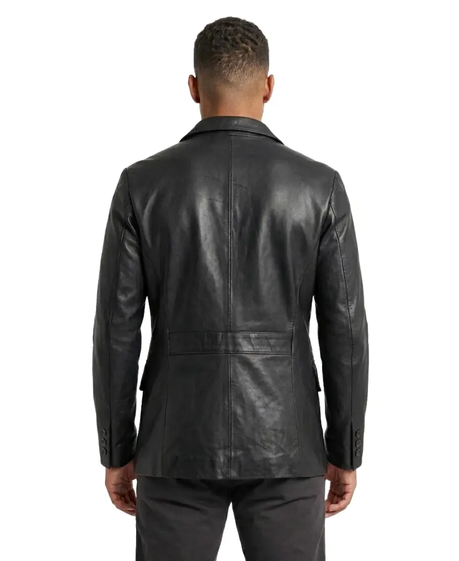 The Premium Black Lambskin Leather Blazer is crafted from soft lambskin leather in a rich black finish that gives it a refined and polished look. It features a notch lapel collar that adds a classic tailored touch, along with a front button closure for a clean and structured front. Full length sleeves are finished with button cuffs, enhancing its sharp blazer style. The smooth viscose lining on the inside ensures comfortable wear throughout the day. Designed with two waist pockets for convenience, this leather blazer delivers a sleek silhouette that works well for formal gatherings, business meetings, or evening occasions.