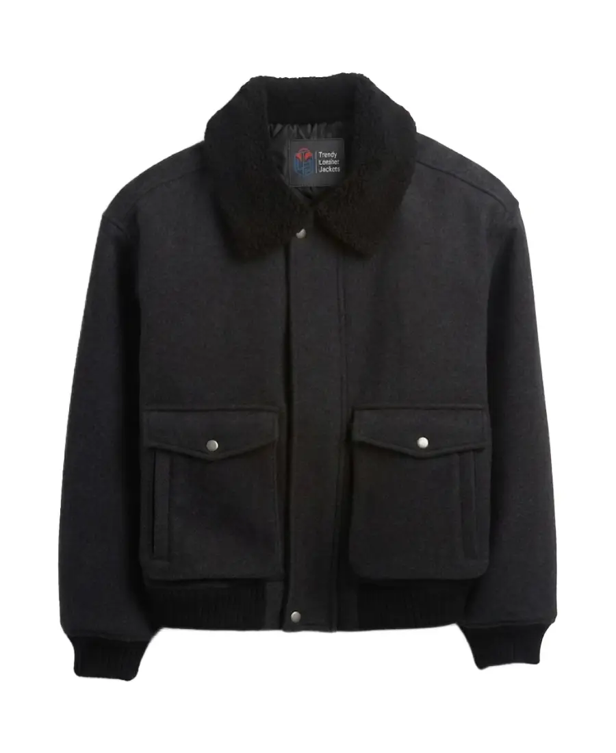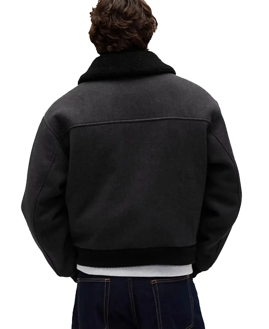 Relaxed Wool Blend Bomber Jacket is made from wool blend in a classic black color that gives it a warm and stylish look. It features a soft sherpa collar that adds comfort and extra warmth. The front has a zipped closure for secure fastening. Full length sleeves come with ribbed cuffs that provide a fitted feel at the wrists. The inner viscose lining adds comfort for daily wear. Two front flap pockets provide space for carrying small essentials while keeping the bomber jacket style clean and casual.