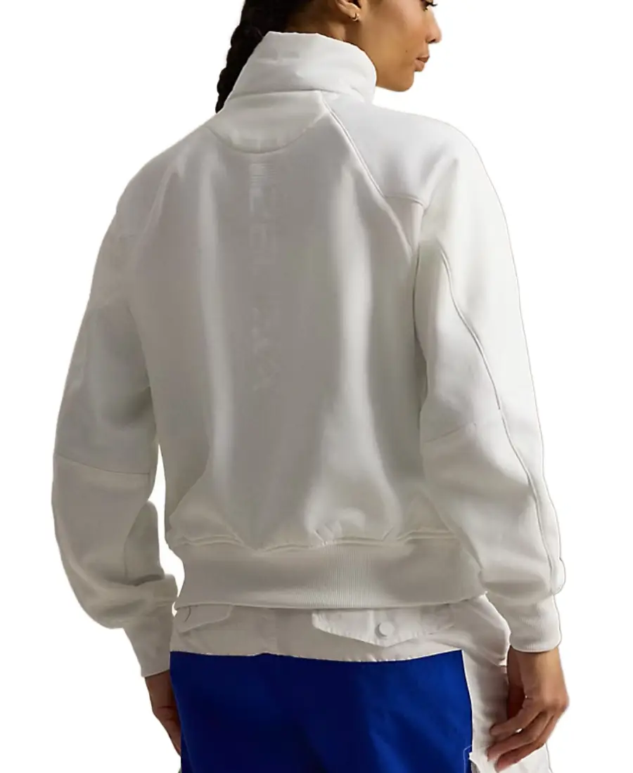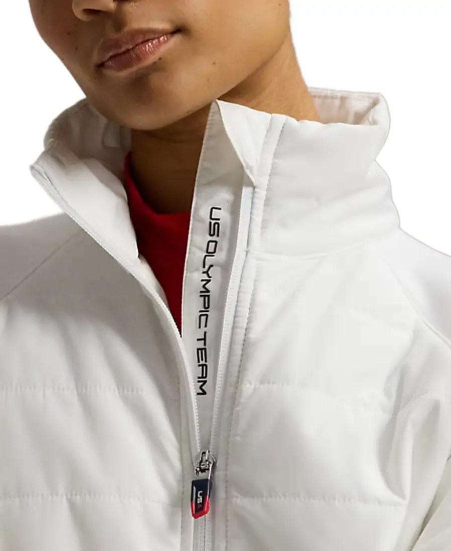 With a smooth zipper closure and two side pockets, this jacket is practical and sleek. Finished in crisp white, it’s perfect for workouts, casual outings, or showing your Team USA pride in style.