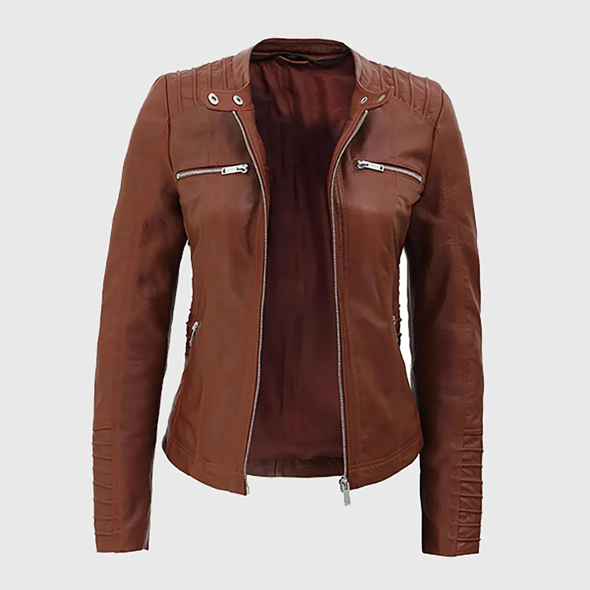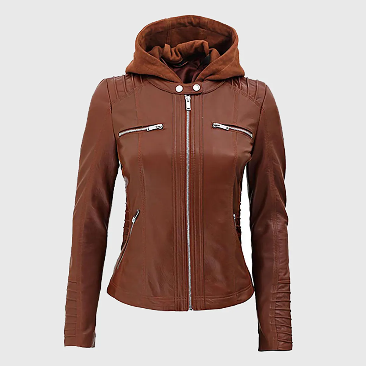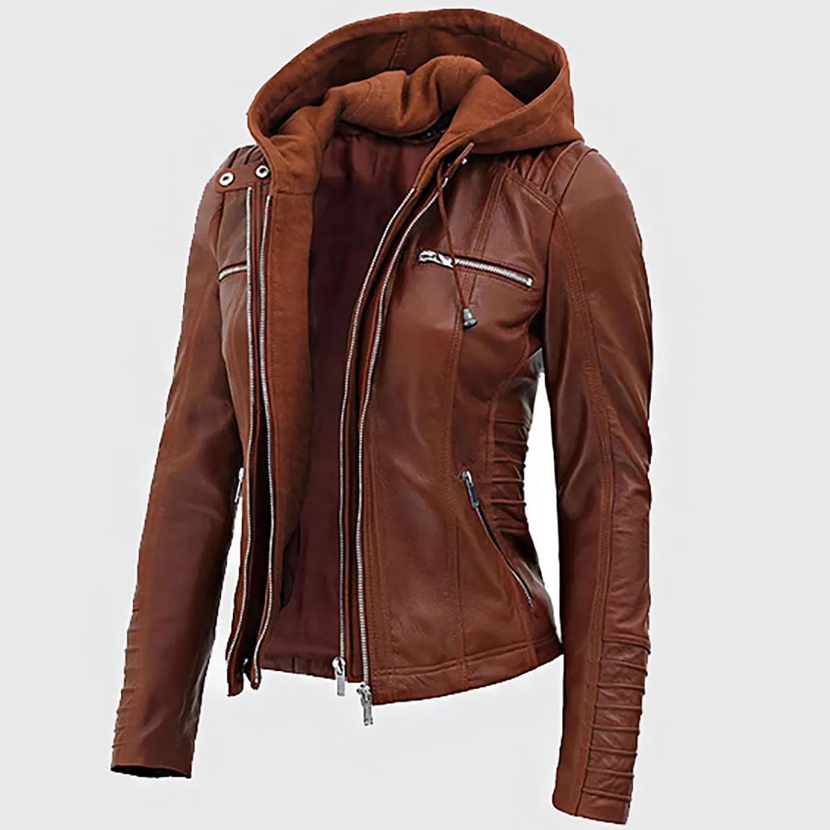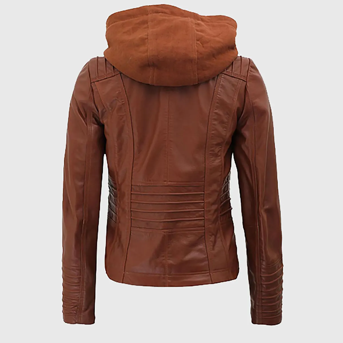 Tina Women’s Cognac Hooded Leather Biker Jacket