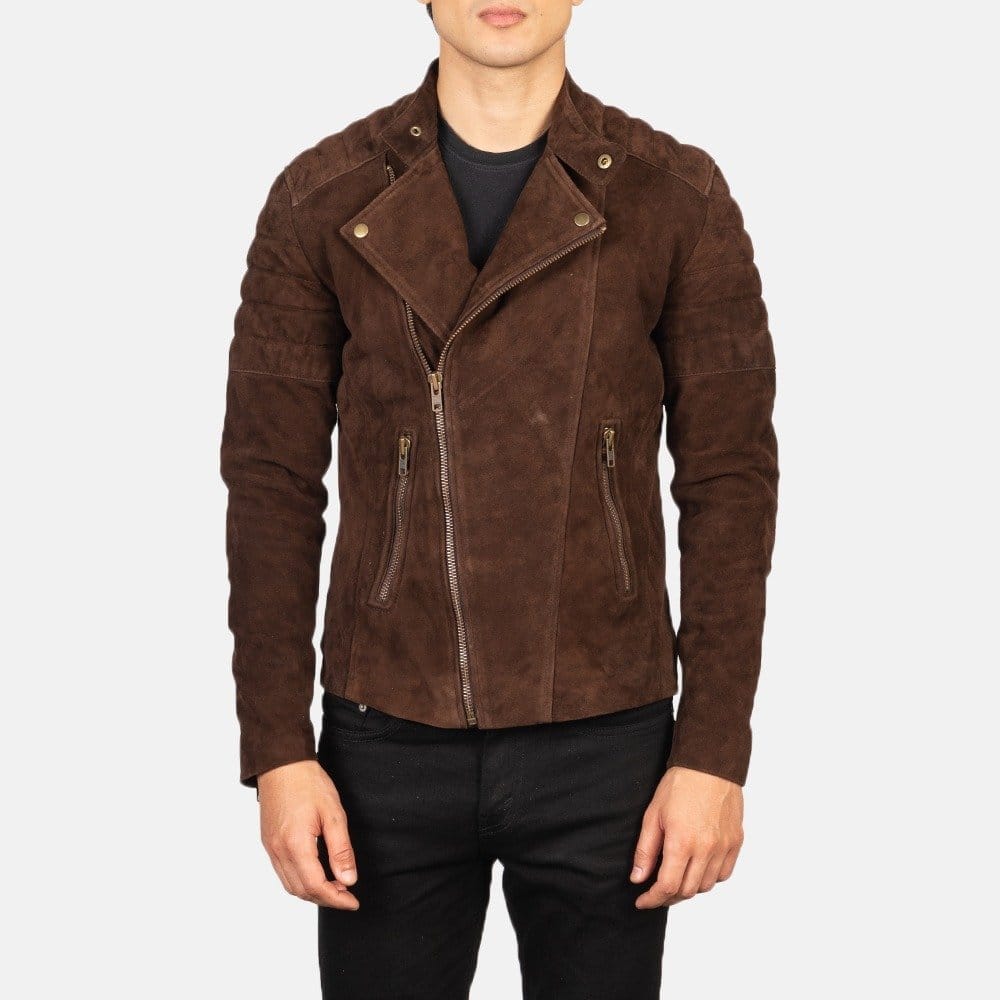 Introducing the Faisor Mocha Suede Biker Jacket, a must-have addition to your wardrobe for both style and functionality. Crafted from real leather, this jacket offers unmatched durability and a luxurious feel.